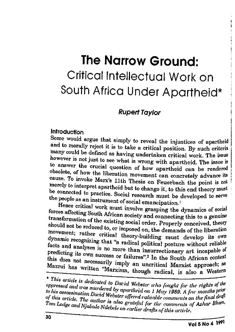 The narrow ground : critical intellectual work on South Africa under apartheid