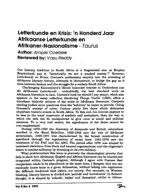 Review of: Ampie Coetzee. Letterkunde & krisis: 'n honderdjaar Afrikaanse letterkunde en Afrikaner-nasionalisme. Bramley: Taurus, 1990