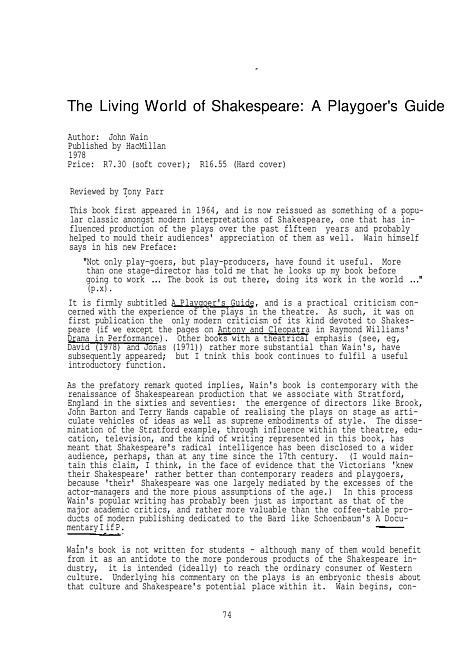 Review of: John Wain. The living world of Shakespeare: a playgoer's guide. London: Macmillan, 1978