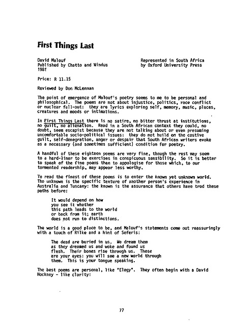 Review of: David Malouf. First Things Last. London: Chatto and Mindus, 1981