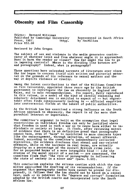 Review of: Bernard Williams (ed.). Obscenity and film censorship: an abridgement of the Williams report. Cambridge: Cambridge University Press, 1981