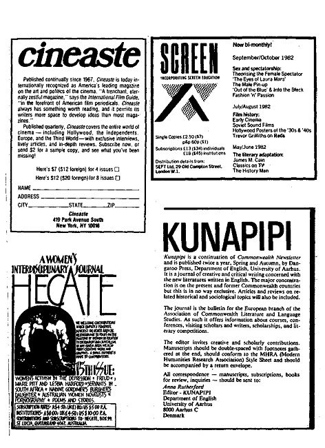 Advertisements of journals "Cineaste", "Screen", "Hecate", and "Kunapipi"