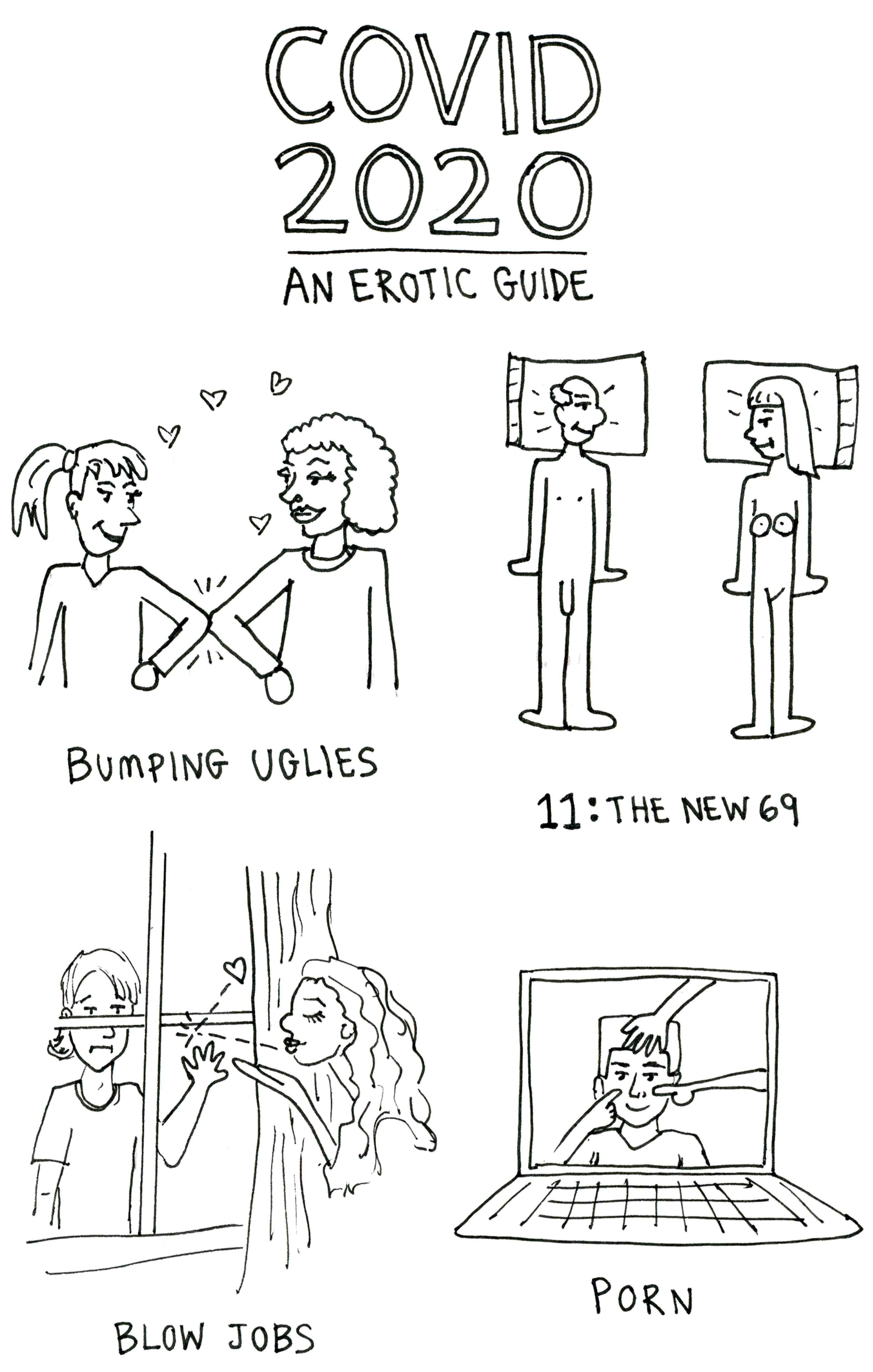 A comic done with black sharpie on a white background, divided into four sections. All of the text within the piece is in capital letters. At the top center of the piece are the outlined words "covid" and beneath that "2020". Underneath the words is a thin line and in standard lettering "an erotic guide". The first: two people stand side by side, touching elbows. The person to the left has long hair pulled in a ponytail and is facing the person to the right, who has shorter curly hair. Hearts float in between the two, and underneath them reads "bumping uglies". The second: two people lying on pillows and looking at each other, naked, with distance between them. The person to the left has short hair and a penis. The person to the right has shoulder length hair, bangs, breasts, and a vagina. Underneath, the words "11: the new 69 69". The third: a person with long hair blowing a kiss to a person with a mullet outside of a window. The air kiss is traced with dotted lines where it bounces off of the window, into a heart. Underneath, the words "blow jobs". The fourth: a laptop. On the screen a person with short hair has three hands touching their face. Beneath the laptop is the word "porn".