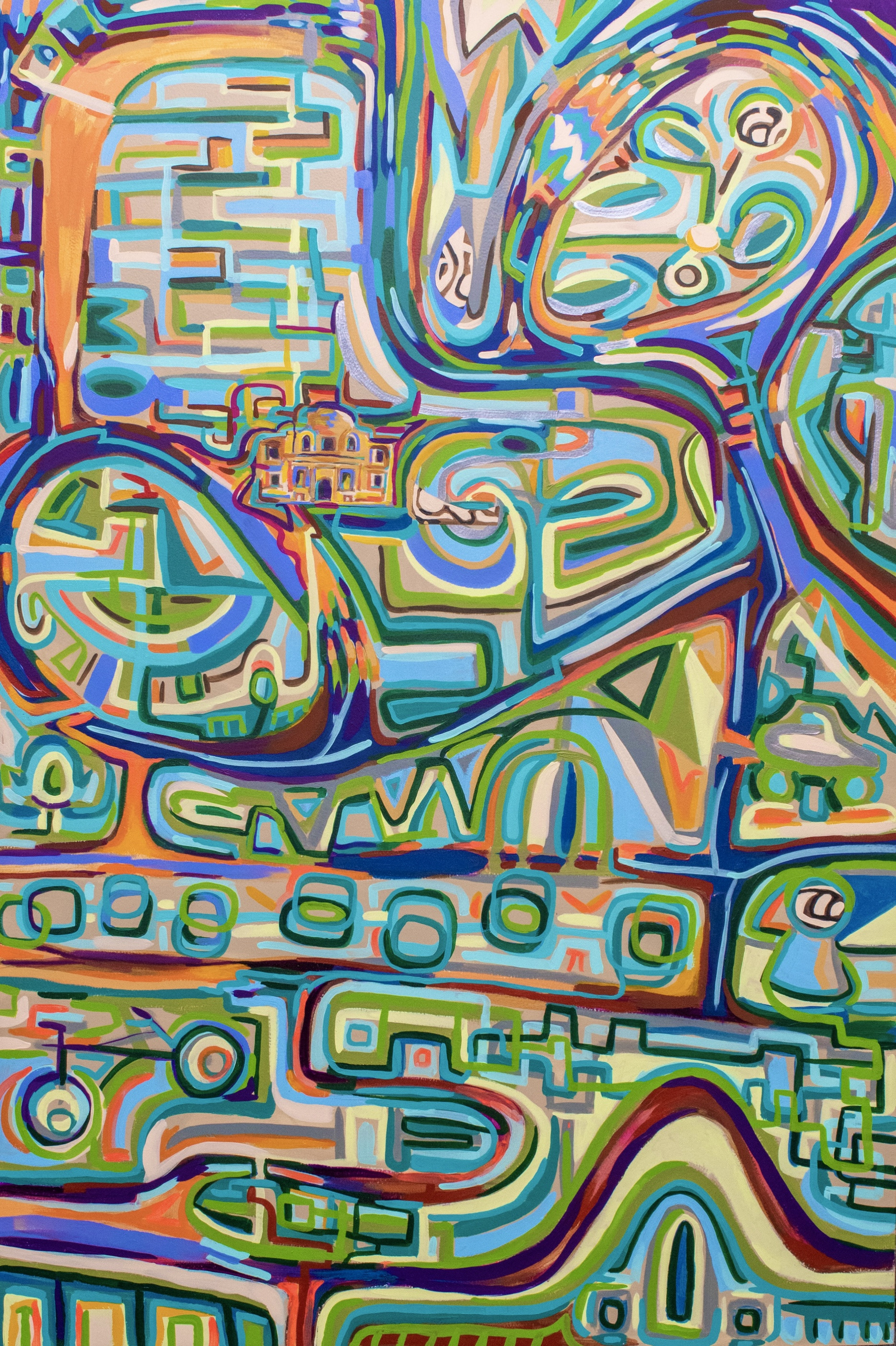 An abstract painting inspired by the city of San Antonio. Shades of cool blue and green circle around the piece, mixed with vibrant oranges and yellows, tracing curves and shapes that resemble buildings, street maps, and urban sprawl. Hidden within is a bicycle and an orange two-story building with a domed roof.