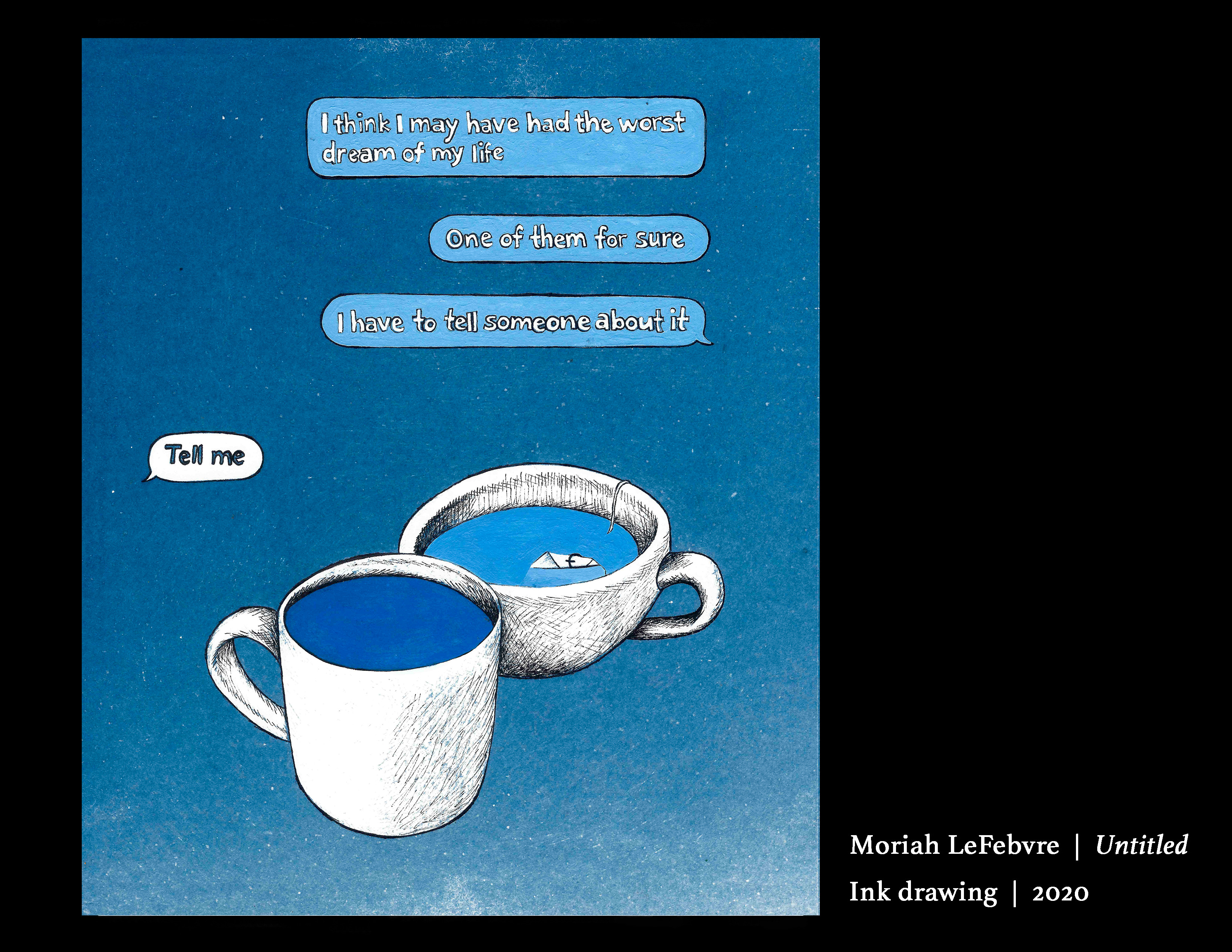 A pen drawing on a blue, cyanotype-printed background. At the bottom center are two mugs, one a standard, coffee mug shape and the other rounder and wider. The coffee mug is white and filled with a deep blue color while the round mug is white and filled with a lighter blue color, a tea bag floating within it. Above the mugs are text messages, beginning on the right side, reading "I think I may have had the worst dream of my life", "One of them for sure", and "I have to tell someone about it", the messages falling beneath the first one with blue text bubbles and white bubble lettering outlined in black. To the left is the single message "Tell me" in a white text bubble and blue bubble lettering outlined in black. Next to the piece on the right is the name and the words "Moriah LeFebvre", "Untitled", "Ink drawing", and "2020".