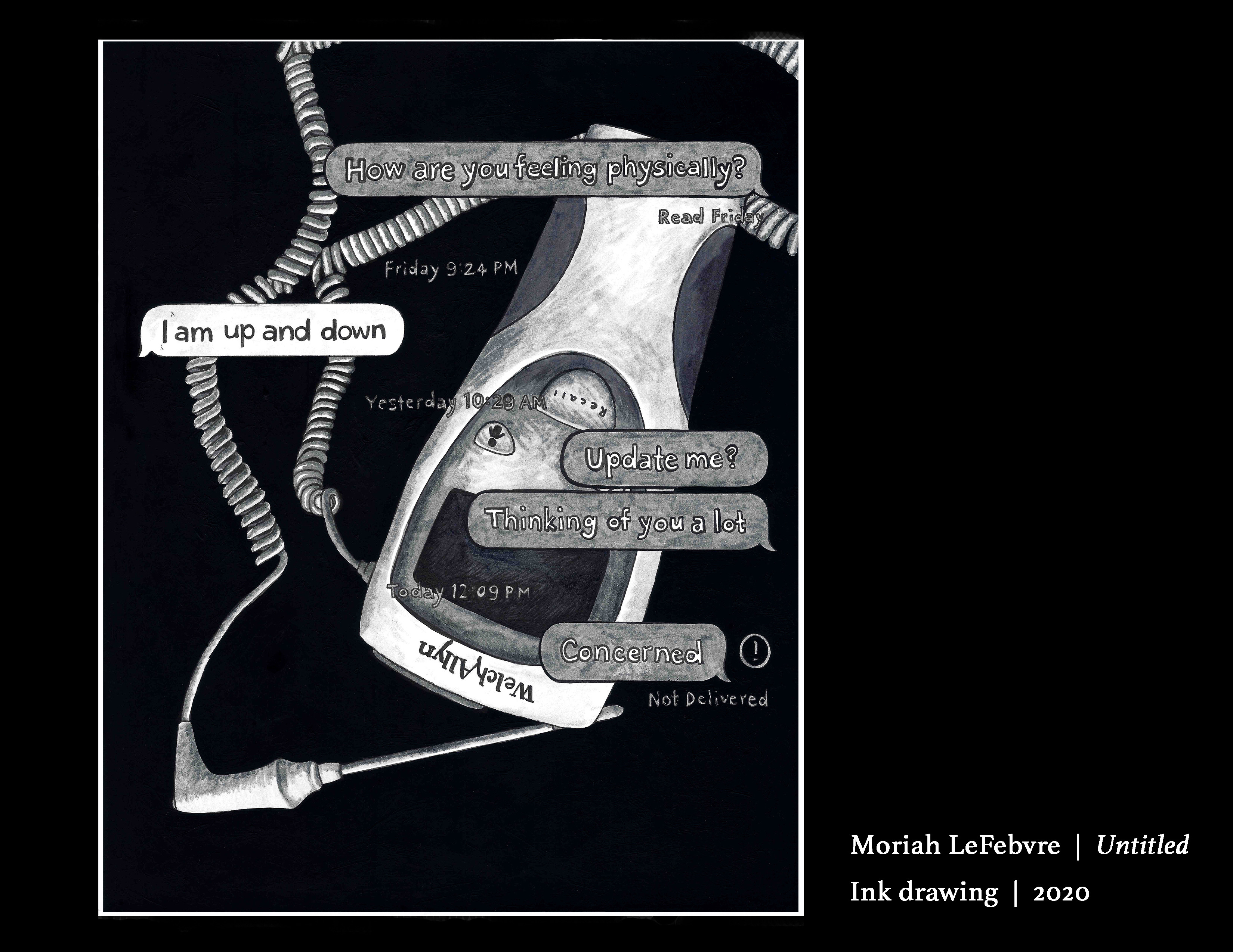 A grayscale pen drawing on a black background. Upside down and to the right side is a large thermometer, the word "WelchAllyn" across the top. Extending from the top of the thermometer is a curly cord that leads to a thin probe at the bottom of the drawing. Overlapping the thermometer and cord is a text message conversation: the first text to the right reads "How are you feeling physically?" a smaller "Read Friday'' underneath; the conversation continues after a timeskip, "Friday 9:24 PM" in the center and below that to the left "I am up and down"; another timeskip at the center, "Yesterday 10:29 AM", and to the right "Update me?" and "Thinking of you alot"; another timeskip, "Today 12:09 PM", and a text to the right reads "Concerned", a small circle with an exclamation point is outlined next to it, and "Not Delivered" is underneath the message. Next to the piece on the right are the name and words "Moriah LeFebvre", "Untitled", "Ink drawing", and "2020".