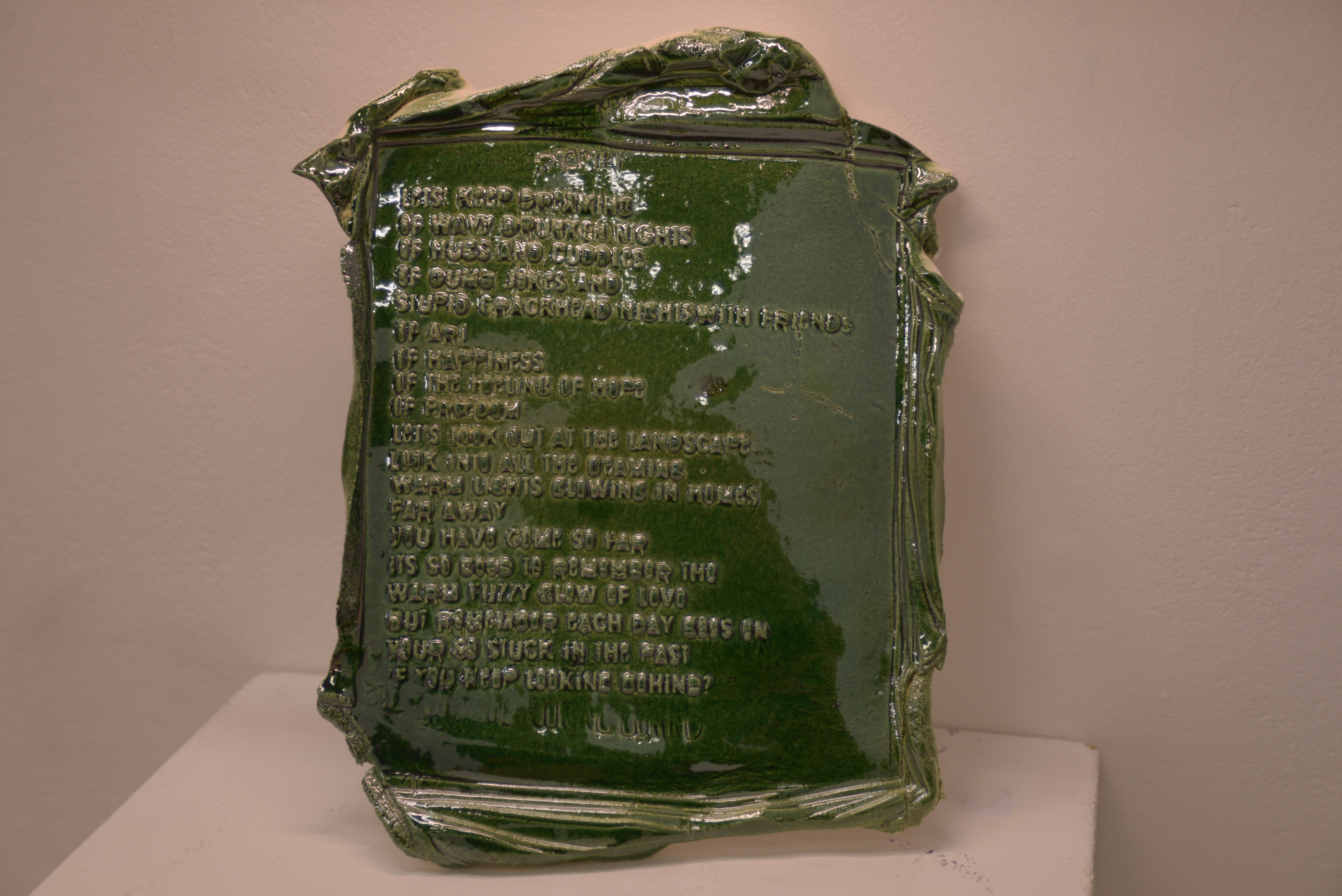 A dark green glazed ceramic in the form of a piece of paper with crumpled edges. It is standing on a white platform, leaning against the white wall behind it. There is a poem imprinted on the page, although it's difficult to read due to a reflective glare. It reads: "Let's keep dreaming Of wavy drunken nights Of hugs and cuddles Of you dumb jokes and Stupid crackhead nights with friends Of art Of happiness Of the feeling of hope Of freedom Let's look out at the landscape Look into all the dreaming Warm lights glowing in homes Far away You have come so far Its so to remember the Warm fuzzy glow of love Out remember each day sees in Your so stuck in the past If you keep looking behind"