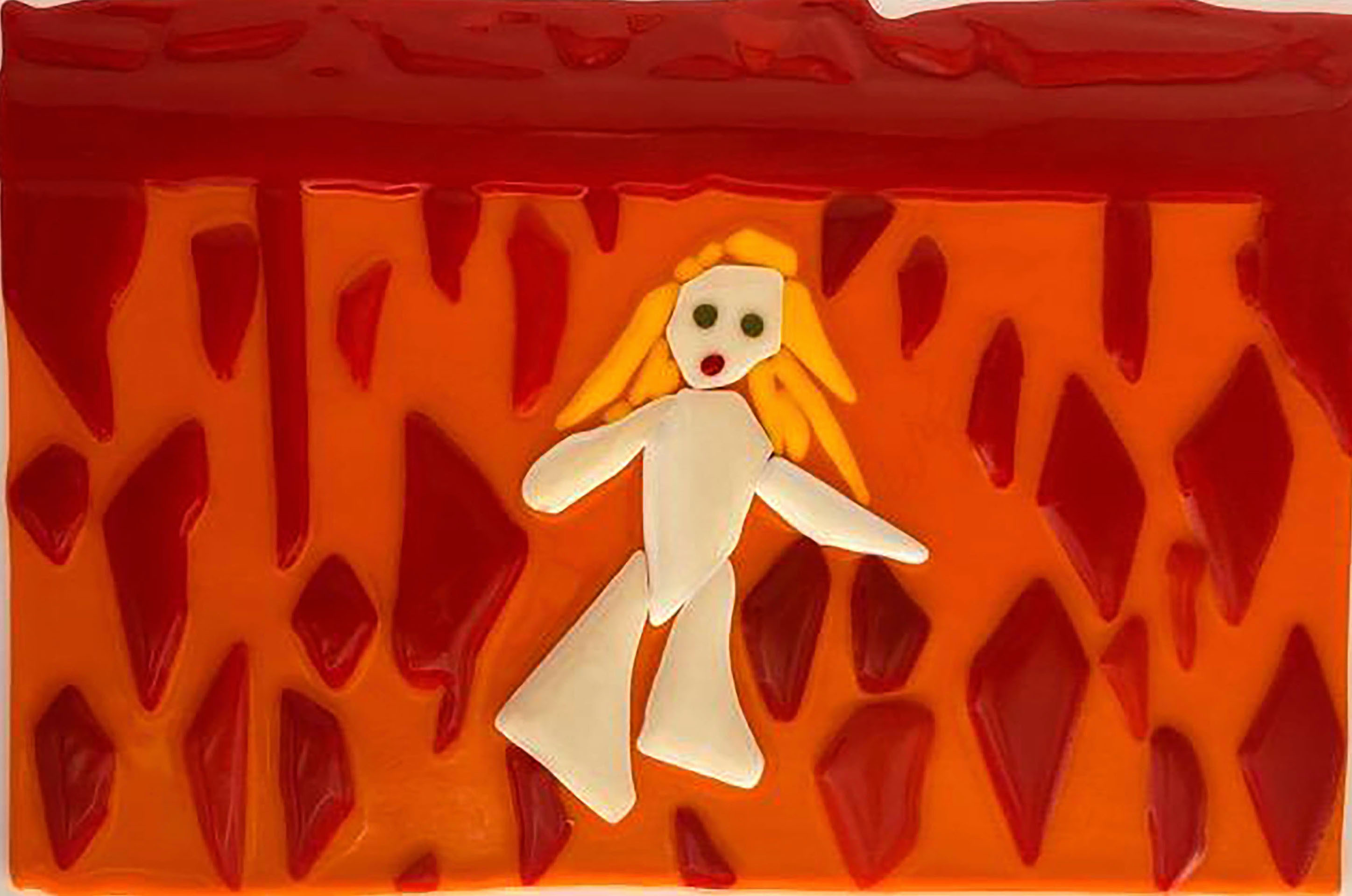 Fused glass pieces on a dark orange background. Bordering the top of the piece is a dark red piece of glass, with smaller, angular pieces of red placed throughout the background. In the center, a fair-skinned person with long yellow hair, green eyes, and red lips stands with their features pulled into a shocked expression.