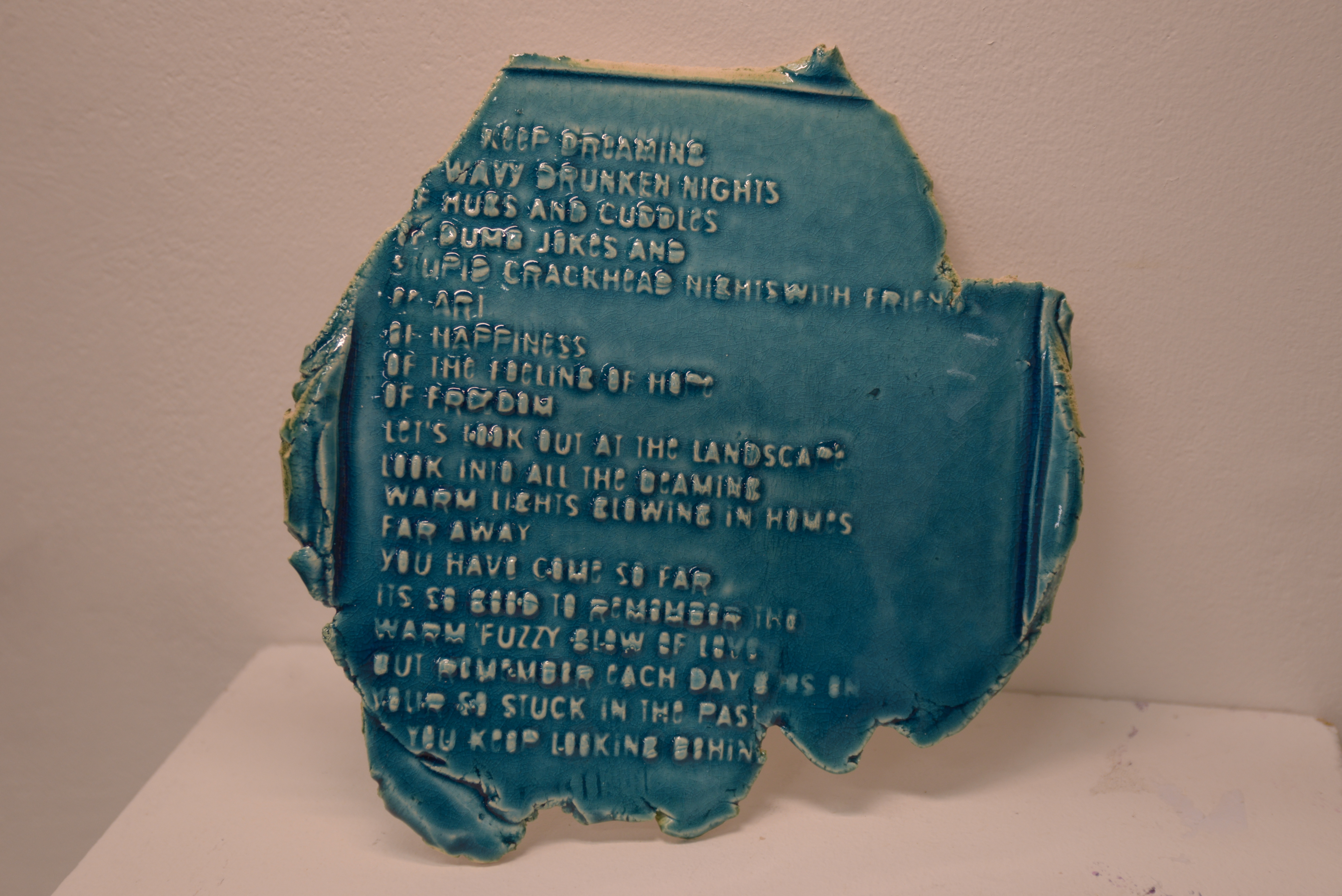 A blue glazed ceramic in the form of a piece of paper with crumpled edges. It is standing on a white platform, leaning against a white wall. There is a poem imprinted on the page. It reads: "Let's keep dreaming Of wavy drunken nights Of hugs and cuddles Of you dumb jokes and Stupid crackhead nights with friends Of art Of happiness Of the feeling of hope Of freedom Let's look out at the landscape Look into all the dreaming Warm lights glowing in homes Far away You have come so far Its so to remember the Warm fuzzy glow of love Out remember each day sees in Your so stuck in the past If you keep looking behind"
