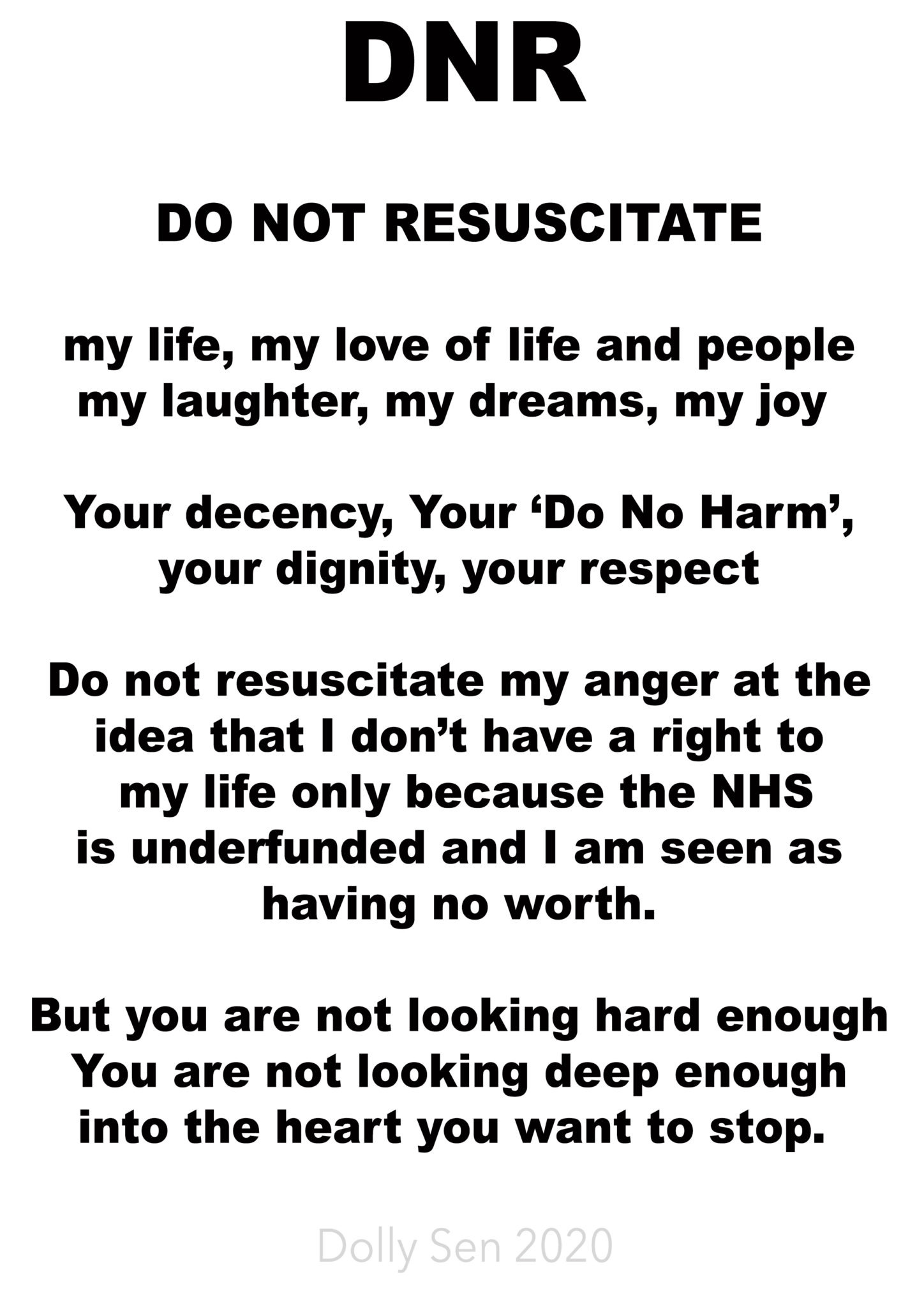 Black text on a white background. The top title is of the biggest size, reading "DNR" in bold, capital letters. Underneath is the heading "do not resuscitate" in capital letters and a smaller font. Beneath, the text is as follows, separated in paragraphs: "my life, my love of life and people my laughter, my dreams, my joy" in lowercase, "Your decency, your ‘do not harm', your dignity, your respect" with the first letters of most words capitalized, "Do not resuscitate my anger at the idea that I don't have a right to my life only because the NHS is underfunded and I am seen as having no worth.", "But you are not looking hard enough You are not looking deep enough into the heart you want to stop.". In smaller, gray lettering is the watermark "Dolly Sen 2020".
