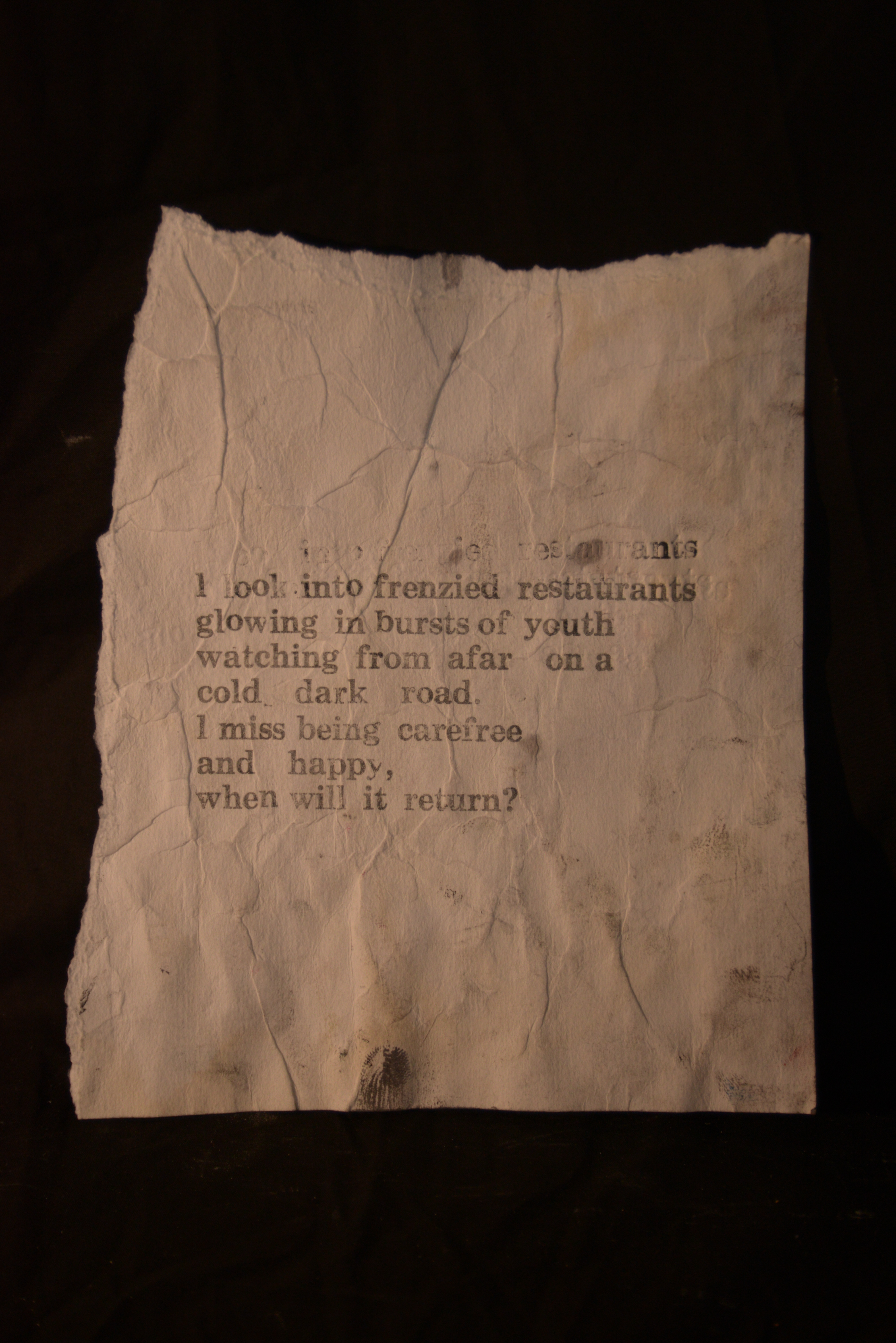 A coarsely textured paper is slightly crumpled, torn, and rough around the edges. A poem has been repeatedly stamped onto the page in brown ink. The poem reads: "I look into frenzied restaurants glowing in bursts of youth watching from afar on a cold dark road. I miss being carefree and happy, when will it return?"