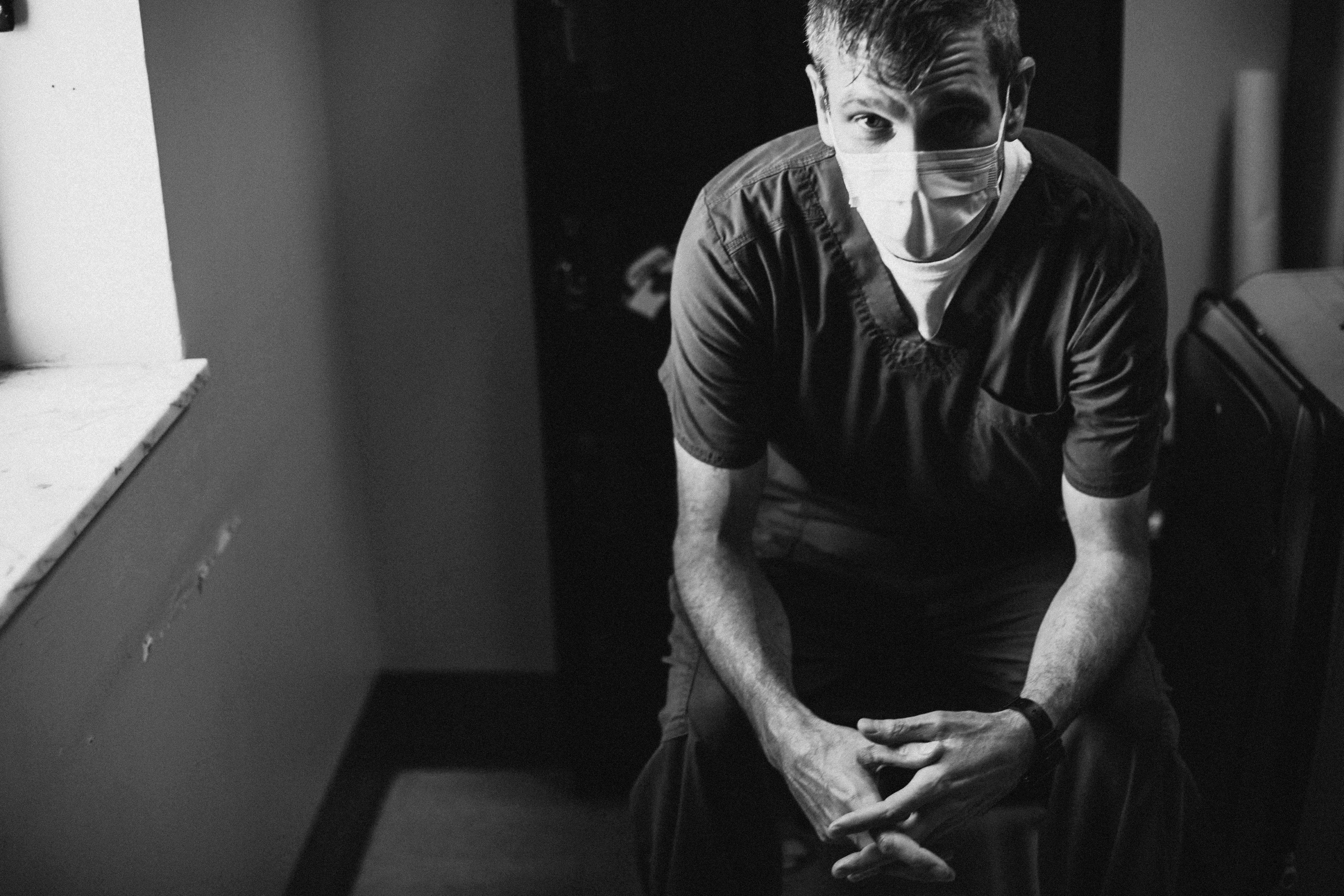 Pictured in black and white, a healthcare worker sits with their hands laced together, looking towards the viewer. Soft light from a window on the left illuminates the left side of their face and their body, leaving the right side of their face in shadow. They are wearing a COVID mask.They are leaned forward slightly, their shoulders looking tense. Behind them, in shadow, is a door.