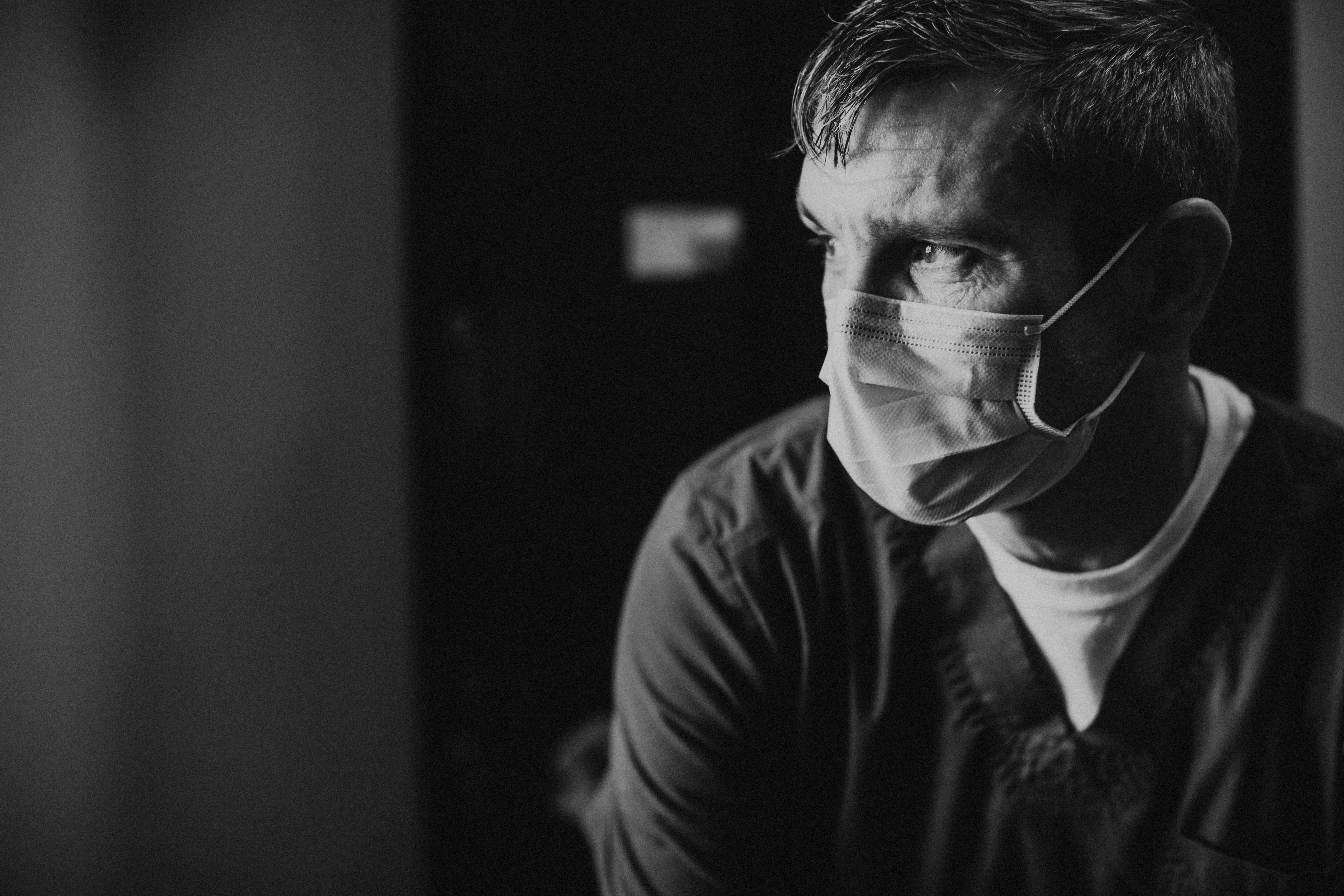 Pictured in black and white, a healthcare worker looks into the distance. Half of their face is covered by a surgical mask, but the part of their face that is visible looks concerned or conflicted. They are wearing scrubs. Light comes from the left, illuminating their face. In the shadowy background is a door with a label too hazy to read.