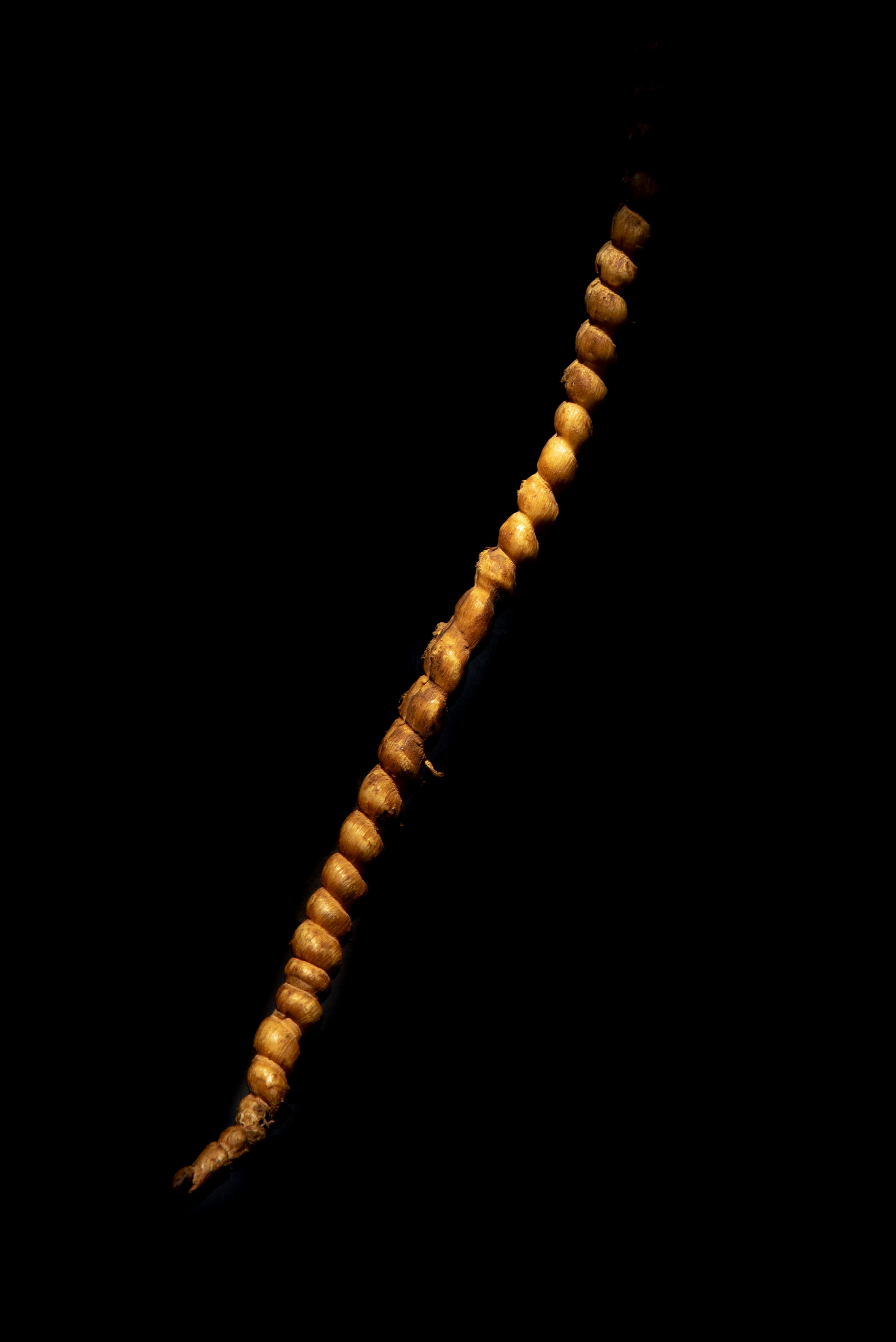 A whip made from a cow's tail, pictured horizontally against a dark background. The whip is long, a yellow-brown color, and has ridges that segment it into smaller rounded shapes. The majority of the whip is in light while the top part is in shadow.