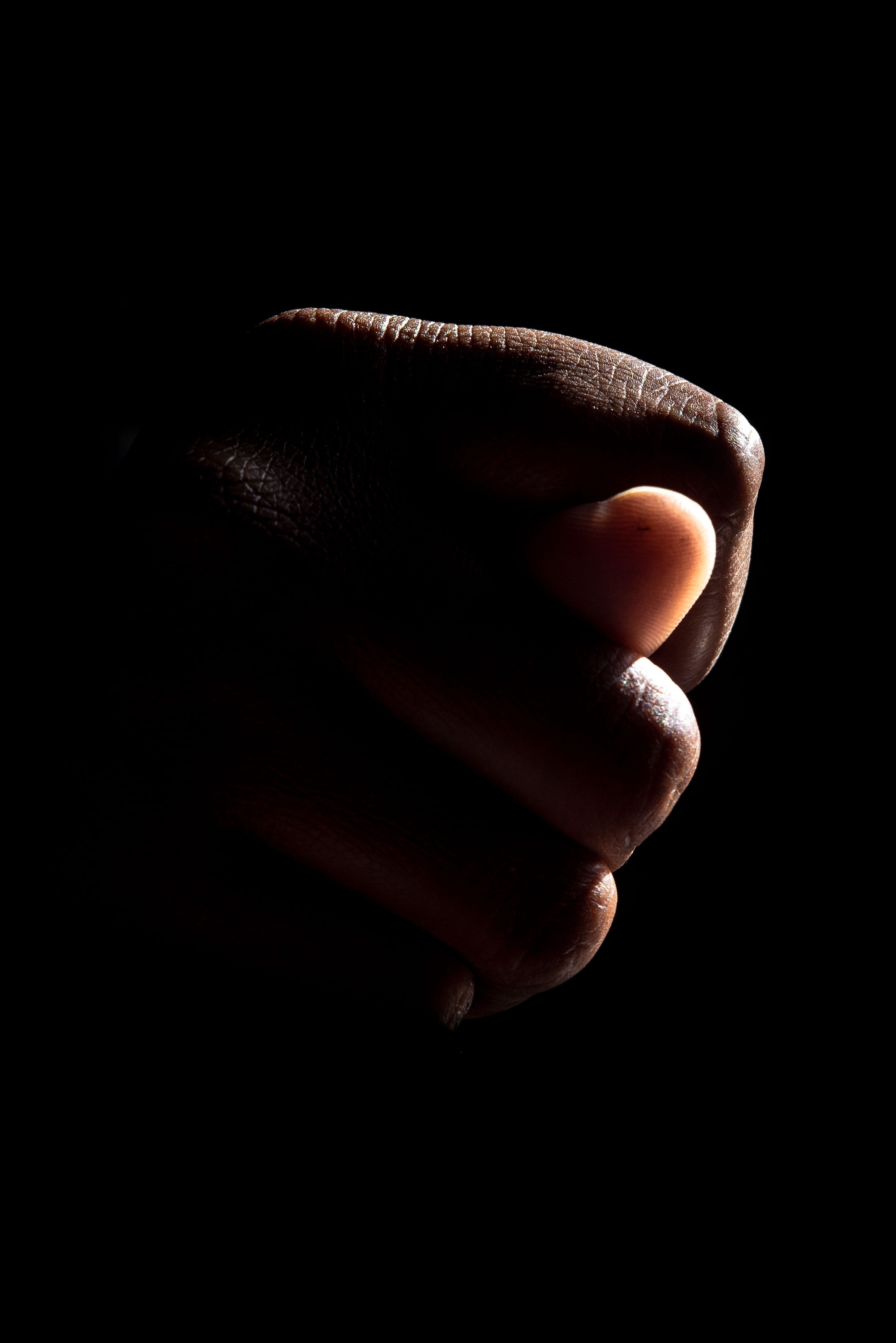 A dark-skinned hand pictured against a dark background. The hand is positioned in a horizontal fist, with the thumb tucked between the pointer finger and middle finger; a gesture used to ward off evil spirits. The majority of the hand is in shadow.