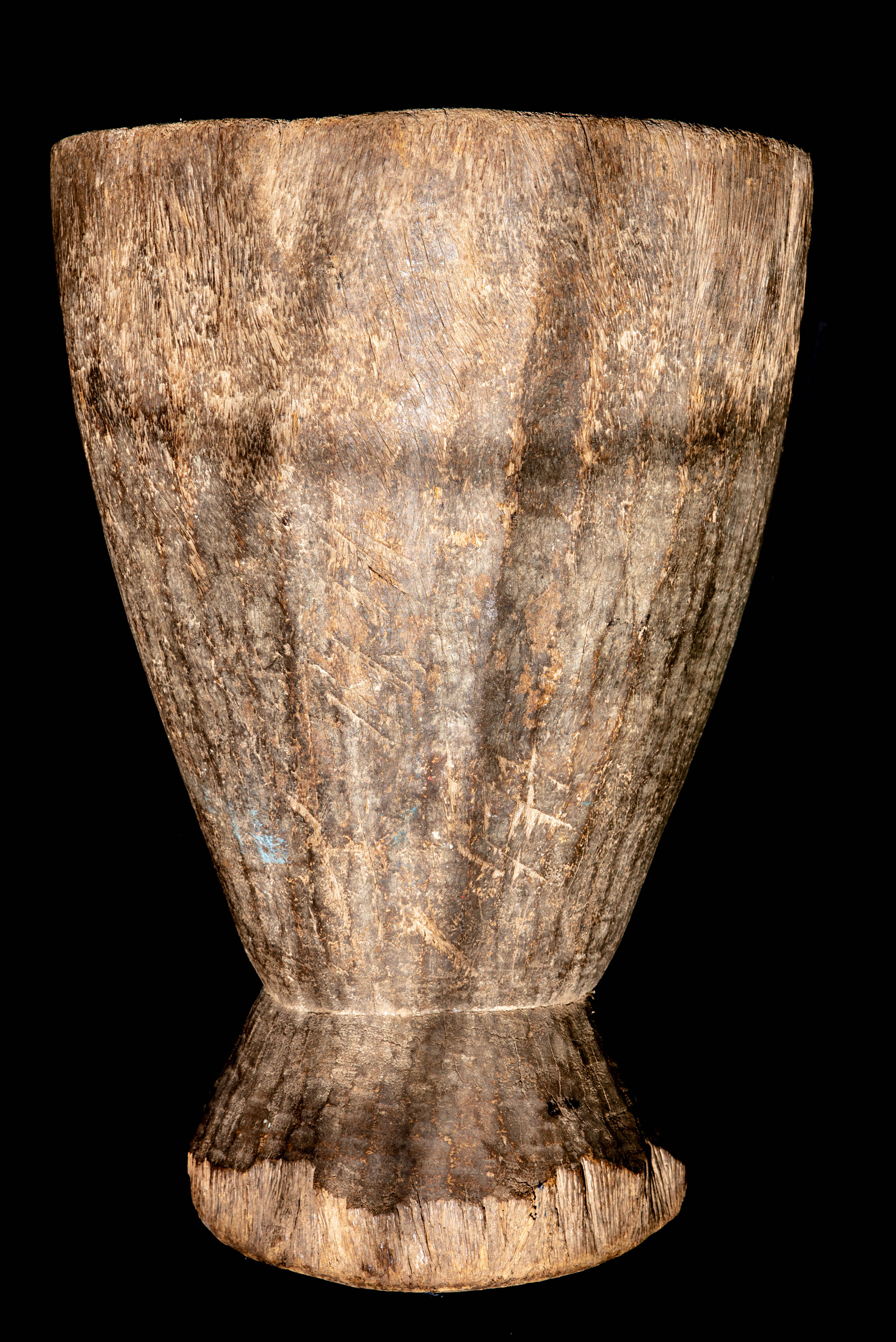 A tall, dark wooden mortar pictured against a dark background. The body of the bowl is large and tapers into the foot of the bowl. The wood is textured and worn revealing the tan underside of the material. There are two dark, long horizontal lines that span from the top to the bottom of the mortar, and three vertical lines that intersect them in the middle and bottom.