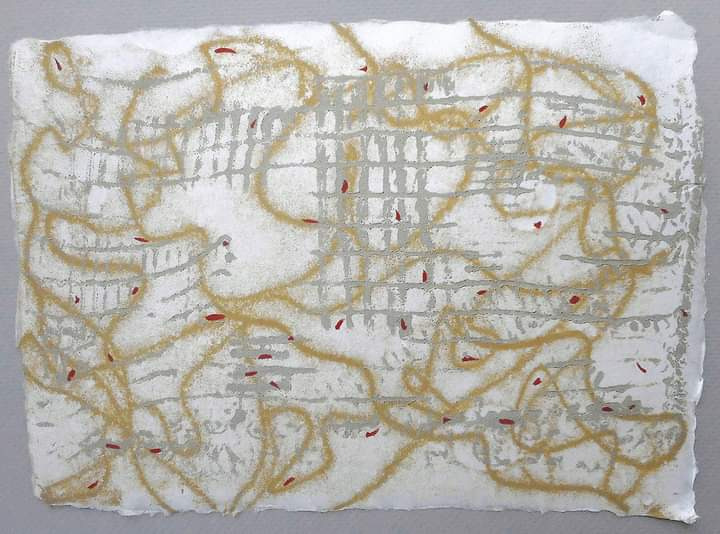 A print with watercolor on handmade white paper. Throughout the piece, horizontal and vertical gray lines intersect and overlap like a street map. Entangling all through the paper is a yellow print, resembling that of a string overlapping itself to create organic shapes. Small red marks are spread out, marking places on the page.