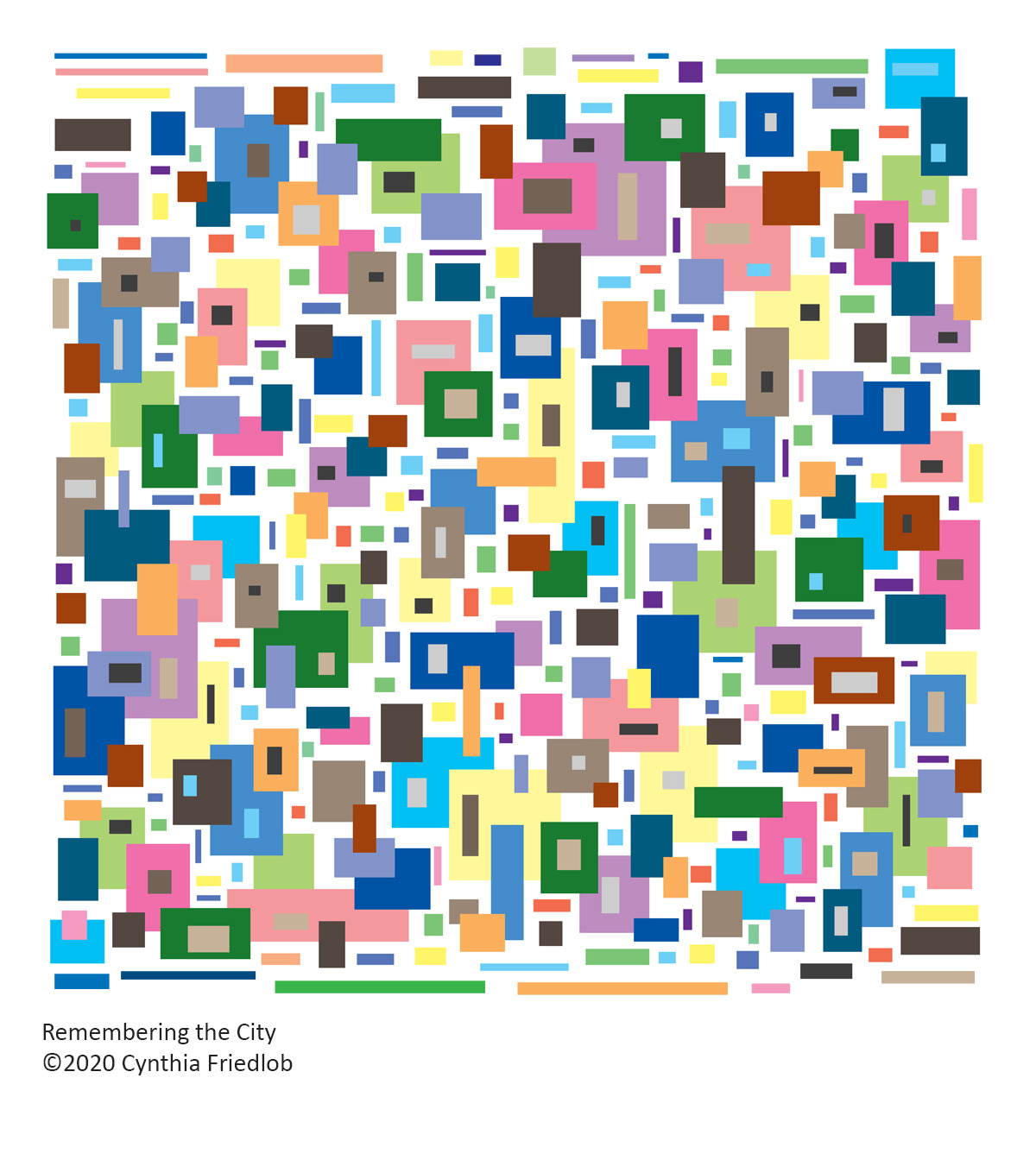 An abstract digital drawing on a white background. The drawing is composed of different sized geometric squares and rectangles. The squares and rectangles have a bright color palette, filled with various shades of blues, purples, browns, greens, yellows, oranges, and pinks. The shapes overlap each other, and many of them have other contrasting colored shapes within them. Underneath the piece to the left side are the words and name "Remembering the City" and beneath that with a copyright symbol "2020 Cynthia Friedlob" in a black, standard font.