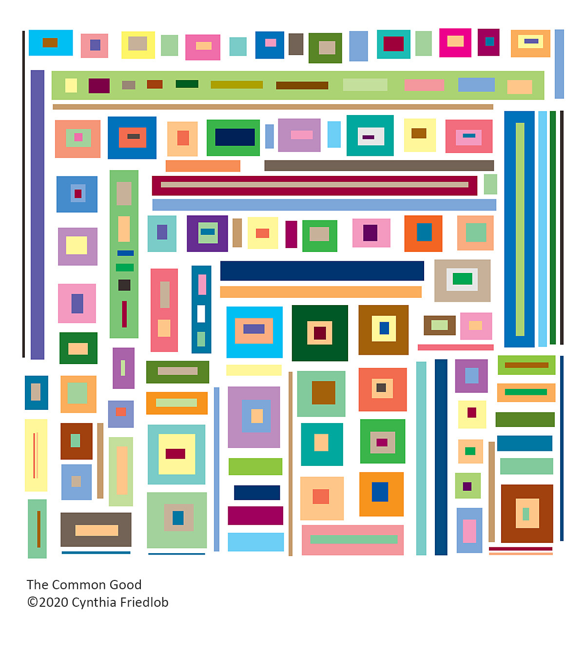 An abstract digital drawing on a white background. The drawing is composed of different sized geometric squares and rectangles. The squares and rectangles have a bright, spring-like color palette, filled with various shades of blues, purples, browns, greens, yellows, oranges, and pinks. The shapes are separated, but many have shapes of contrasting colors within them. Underneath the piece to the left side are the words and name "The Common Good" and beneath that with a copyright symbol "2020 Cynthia Friedlob" in a black, standard font.