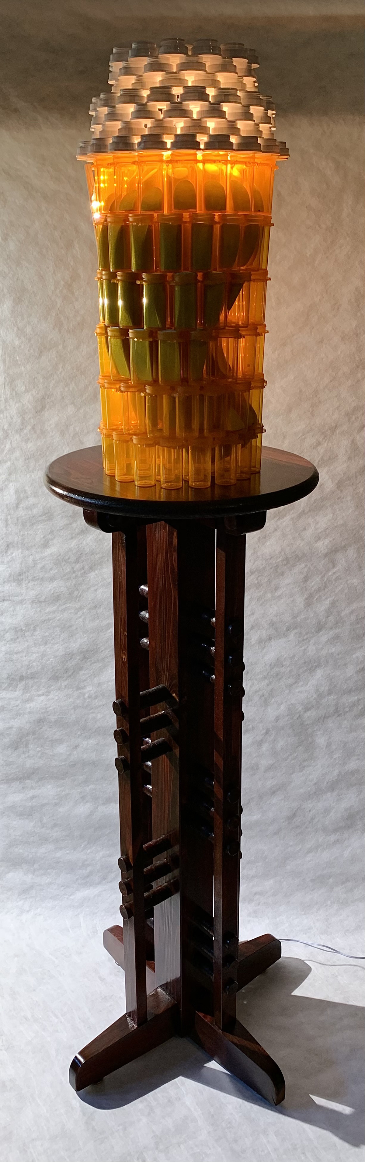 Pill bottles and LEDs on wooden pedestal