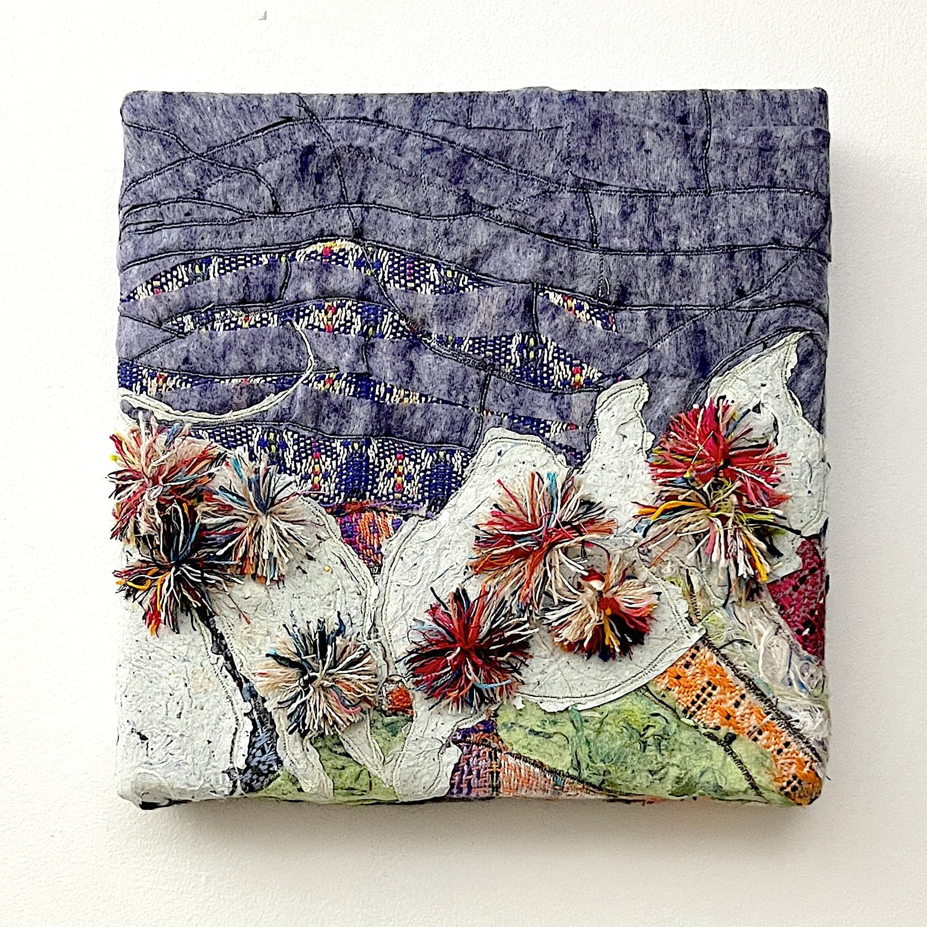 A mix of fabrics and textiles on canvas. The top portion of the canvas is a dark and light blue piece of fabric, separated into waves by black thread. As the fabric leads down, the waves become separated by strips of red, white, and blue woven fabric. The bottom portion has patches of white textured fabric, with colorful green and orange fabrics in the bottom right corner. Bunched up on the white textured fabric are nine frayed, multicolored string pom poms.