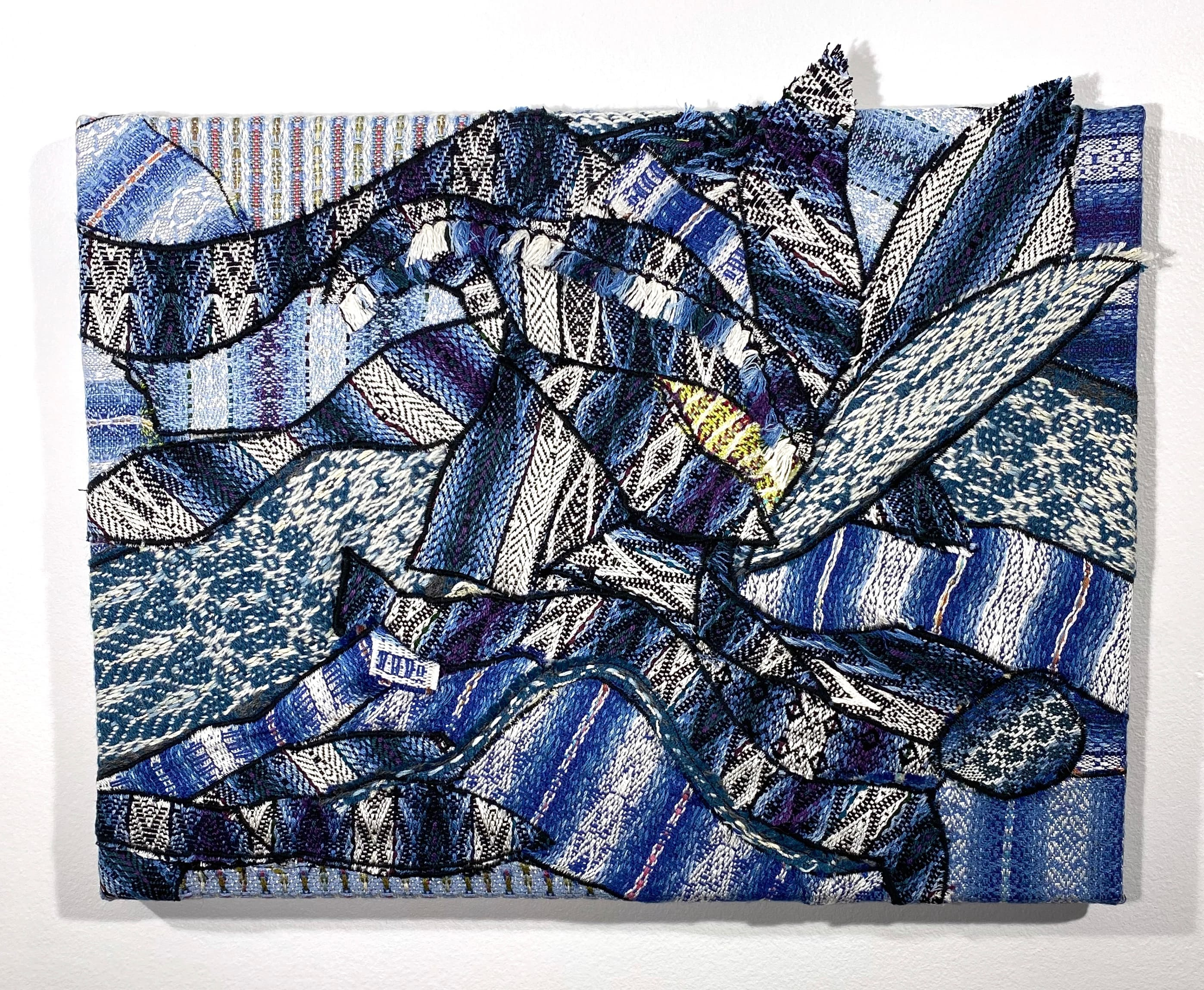 A mix of fabric and textiles on canvas. The fabrics are all woven in different patterns of dark blue, light blue, white and black. The pieces are separated by black thread in wavy strips and angular pieces to create abstract shapes.