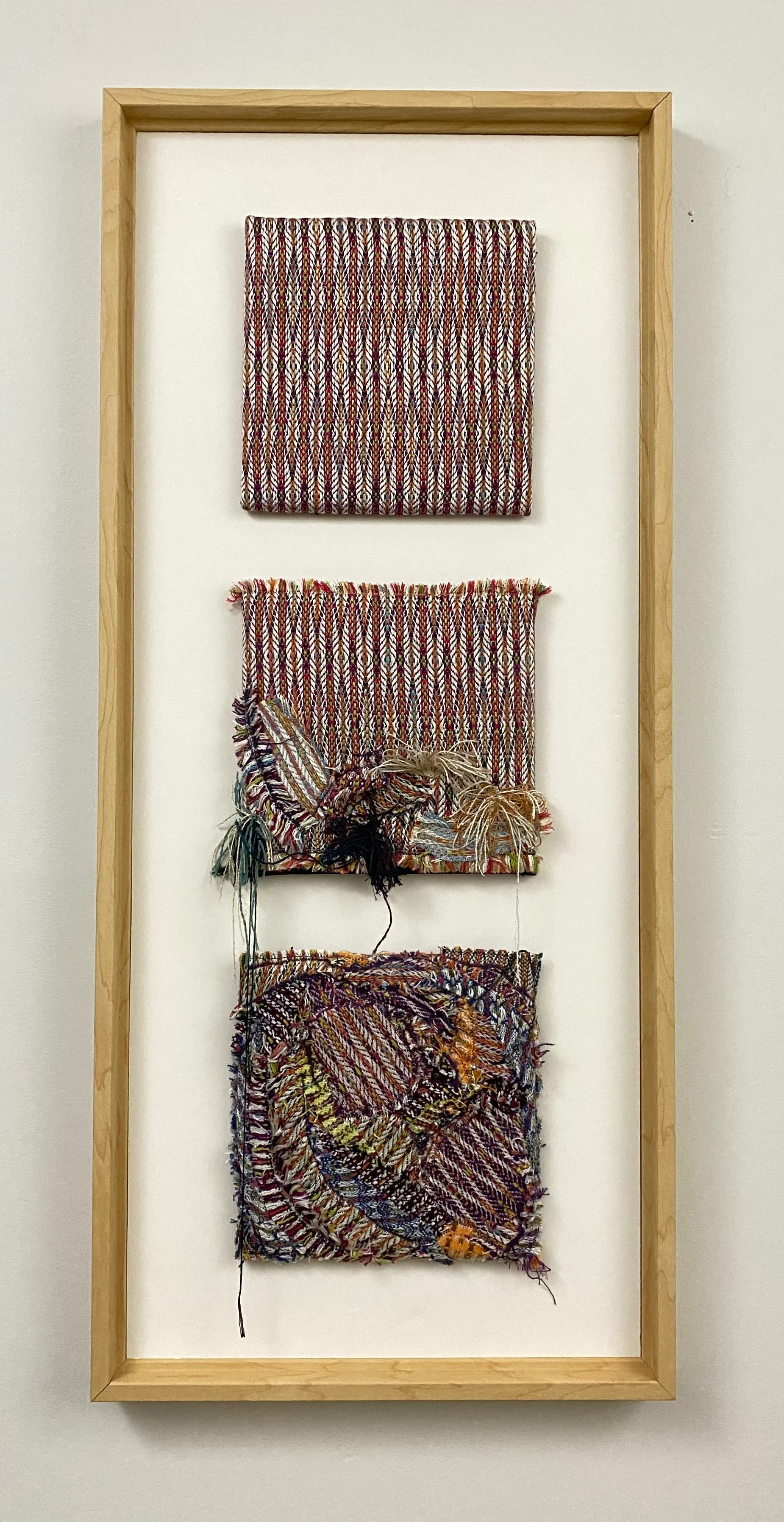 Three square panels of woven fabrics and textiles against a white background in a wooden frame. The first panel on the top is a uniform piece with a multicolored, feather-like pattern. Underneath, the second panel has the same fabric as a base, the top edges frayed and the bottom almost ripped up, strings from the fabric gathering outwards as if the original piece was stretched and torn. The bottom panel has the same fabric piece as the first, but destroyed and deconstructed, making it look as if it was torn up and sewed back on to the original piece.