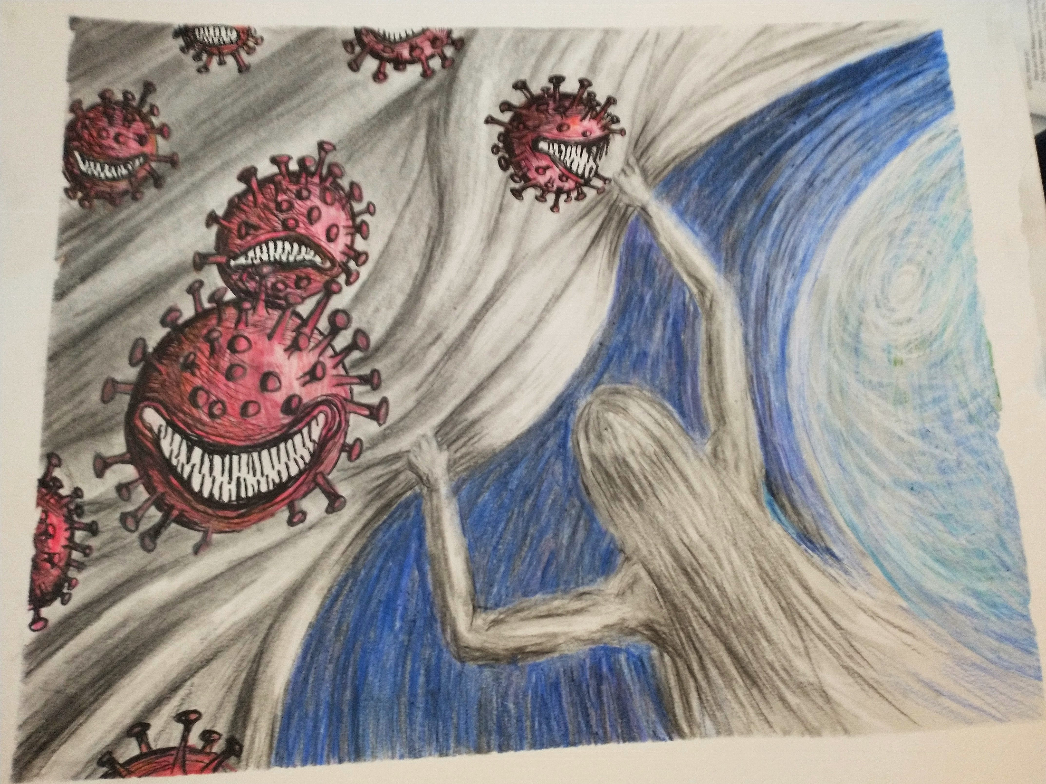 A colored pencil and marker drawing. In the bottom left corner is a person with long hair within a dark blue background, next to a light blue orb. The person is holding back a bunched up fabric on the left side of the page, with red COVID cells that have sharp rows of teeth on it.