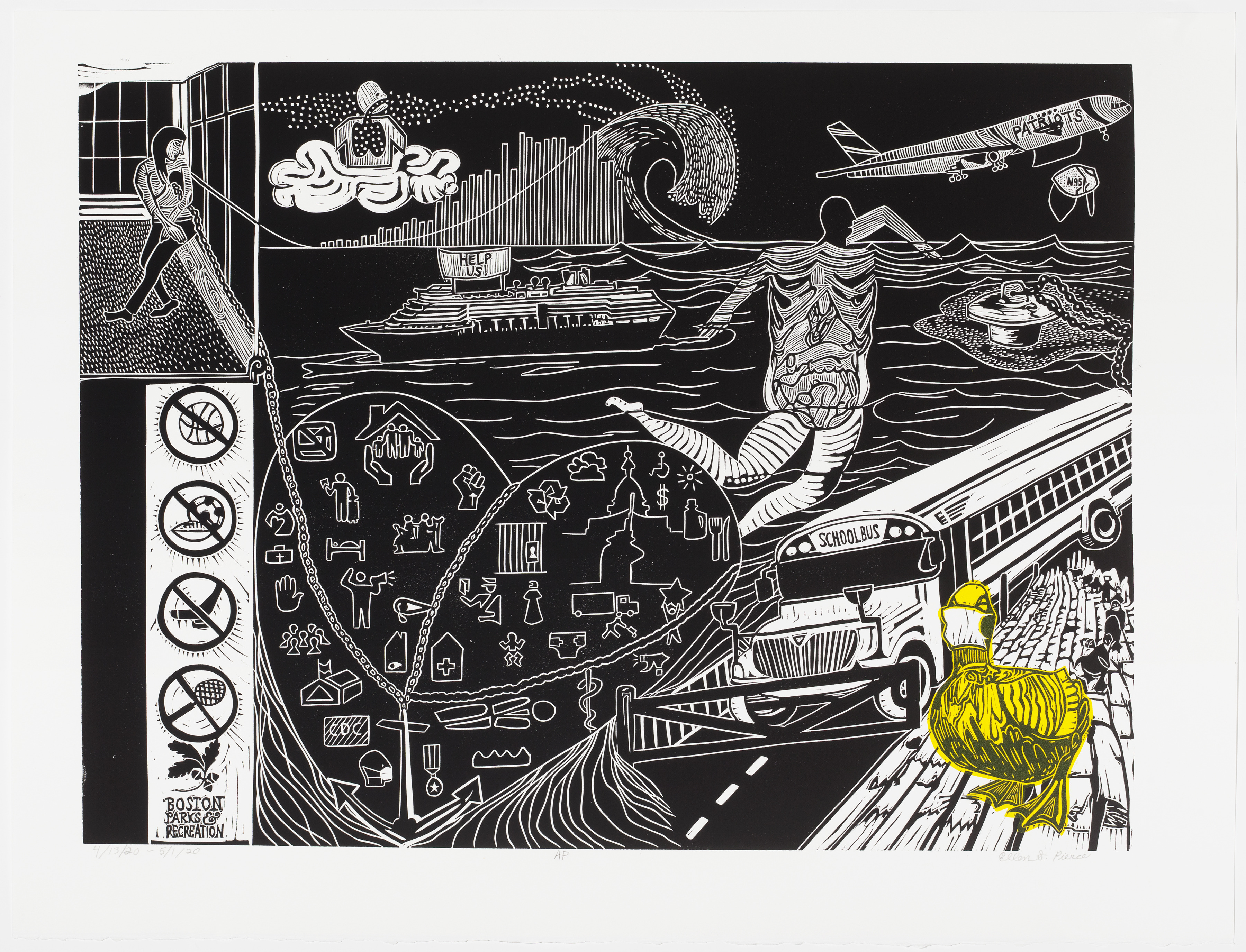 An abstract linoleum print, proofed with black ink and carved to reveal details in white. The top portion has a person sitting in a windowed room, holding a chain for an anchor that reaches down to the bottom. Next to the windowed room is a cloud with the figure of a person's airways and lungs filled with white dots coming from the wave of water next to it. The wave overlaps a bar graph. Beside the wave, a plane labeled with the word "patriots" in capital letters flies upwards, and a COVID mask falls from the open plane door. Beneath the top portion is a sea, where a boat moves towards the windowed room with a banner on top of it that reads "help us" in capital letters. The large figure of a person with visible muscle tissue and internal organs swims towards a pulled drain plug. Underneath the scene to the left is a sign that has different recreational activities crossed out with a prohibition symbol. The chain from the anchor held by the person in the top left ties down a large heart filled with different symbols of life. A school bus drives down a road next to the sea, stopped by a barrier. A yellow duck and ducklings in COVID masks stand on paved ground next to the road.