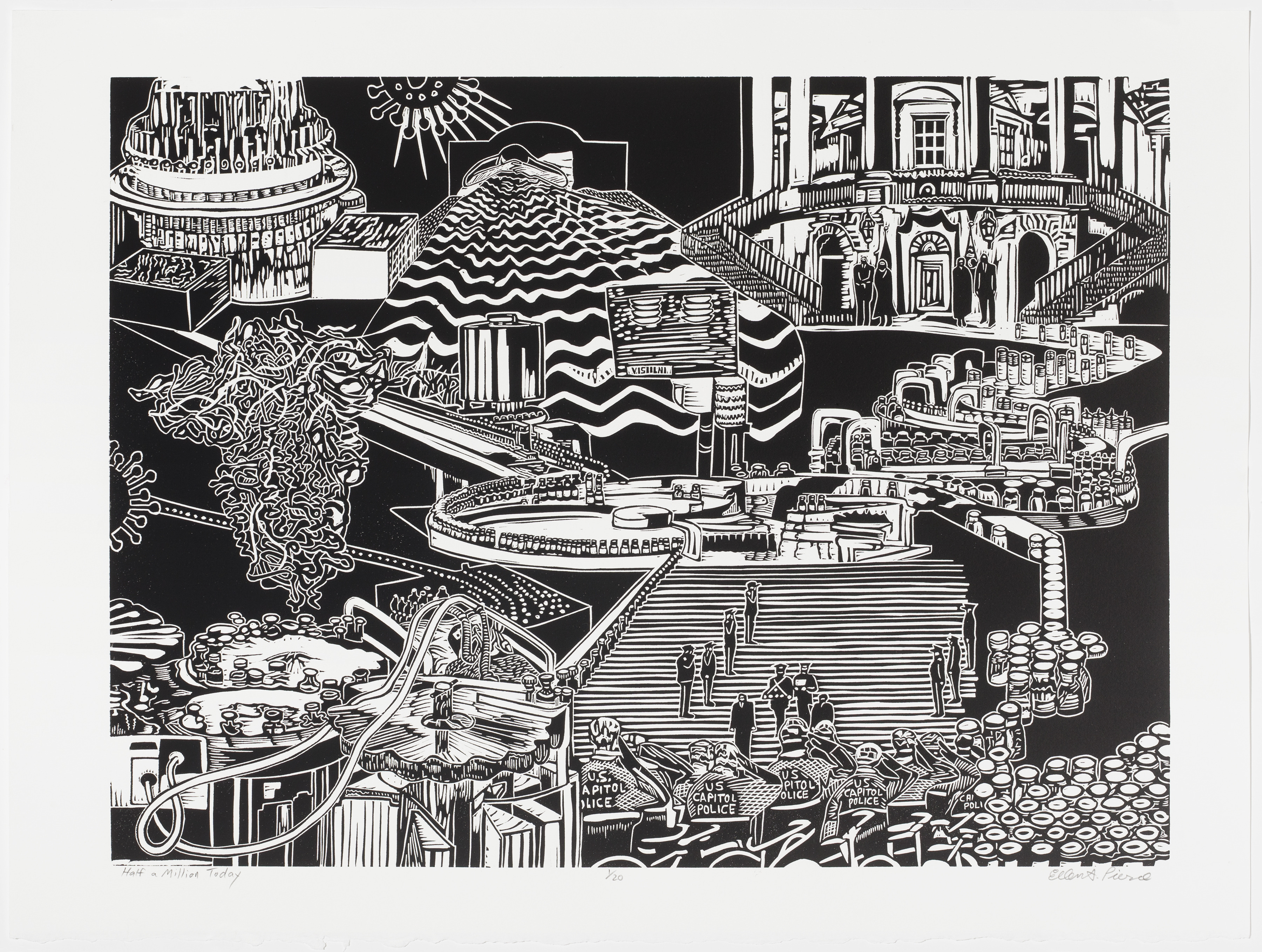 An abstract linoleum print, proofed with black ink and carved to reveal details in white. In the top right corner is a depiction of the White House, four people wearing COVID masks stand in front of it. Following a factory line from the front of the white house, down throughout the piece are small objects that resemble vaccine vials that gather in the bottom right corner and also come from other conveyor belts from the left. Beneath the White House are a large set of steps, lined with officers, at the bottom of the steps a procession of US Capitol Police officers stand in a salute. Next to the White House at the top of the piece is a person lying in a bed, a COVID cell covering a sun ray above them. To the left of the bed is a crumbling colosseum. Below the colosseum is a tangle of intersecting lines, and below it, stacks of mushroom-like shapes.