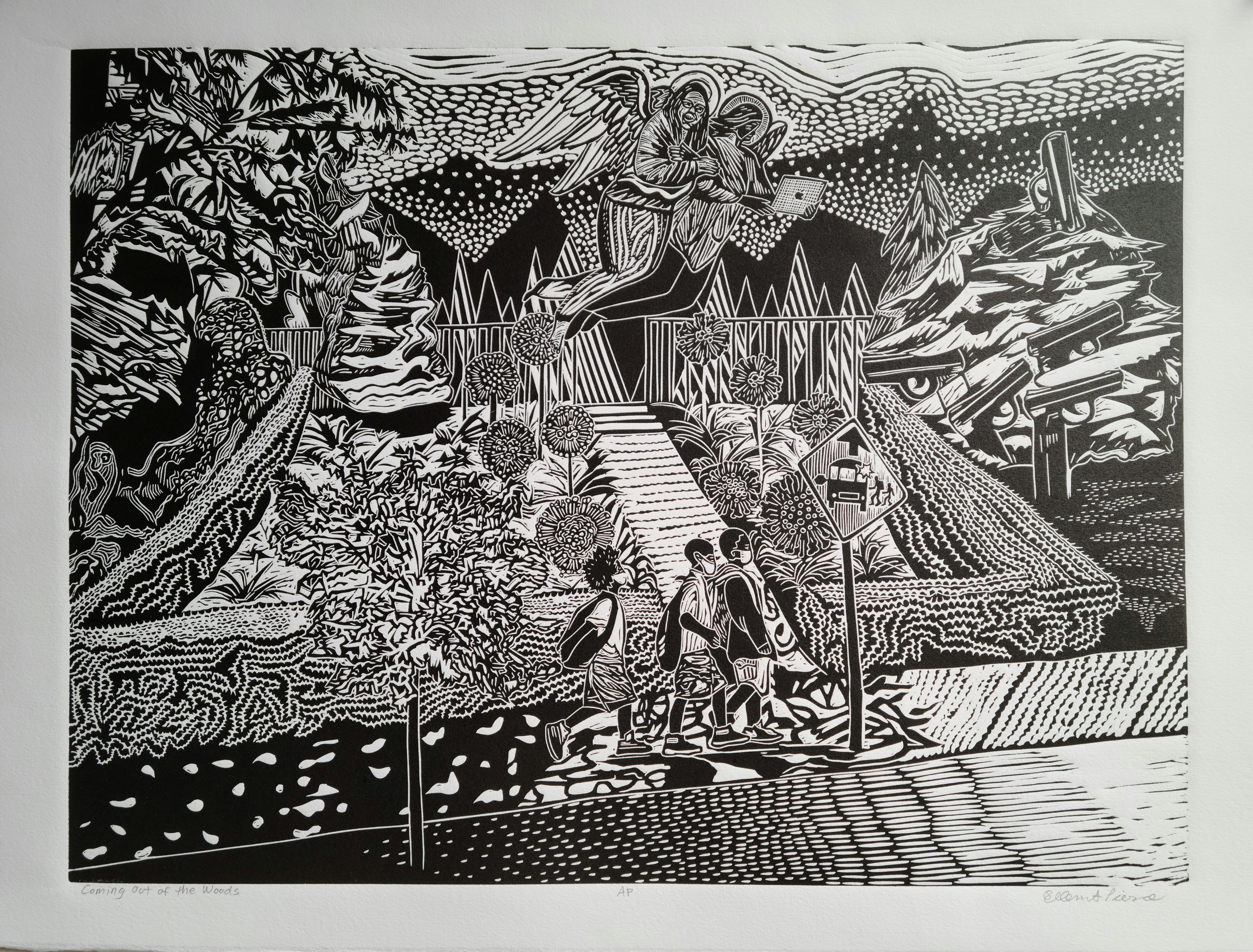 An abstract linoleum print, proofed with black ink and carved to reveal details in white. Three school children wearing COVID masks walk towards a bus stop sign on a sidewalk. Next to the sidewalk is a garden of sunflowers and trees. Above the garden, dotted forms that could be mountains or clouds fill the space. Next to the garden on the right is a pile that covers about five handguns. Flying above the children are two angels, one on the right holding a laptop.