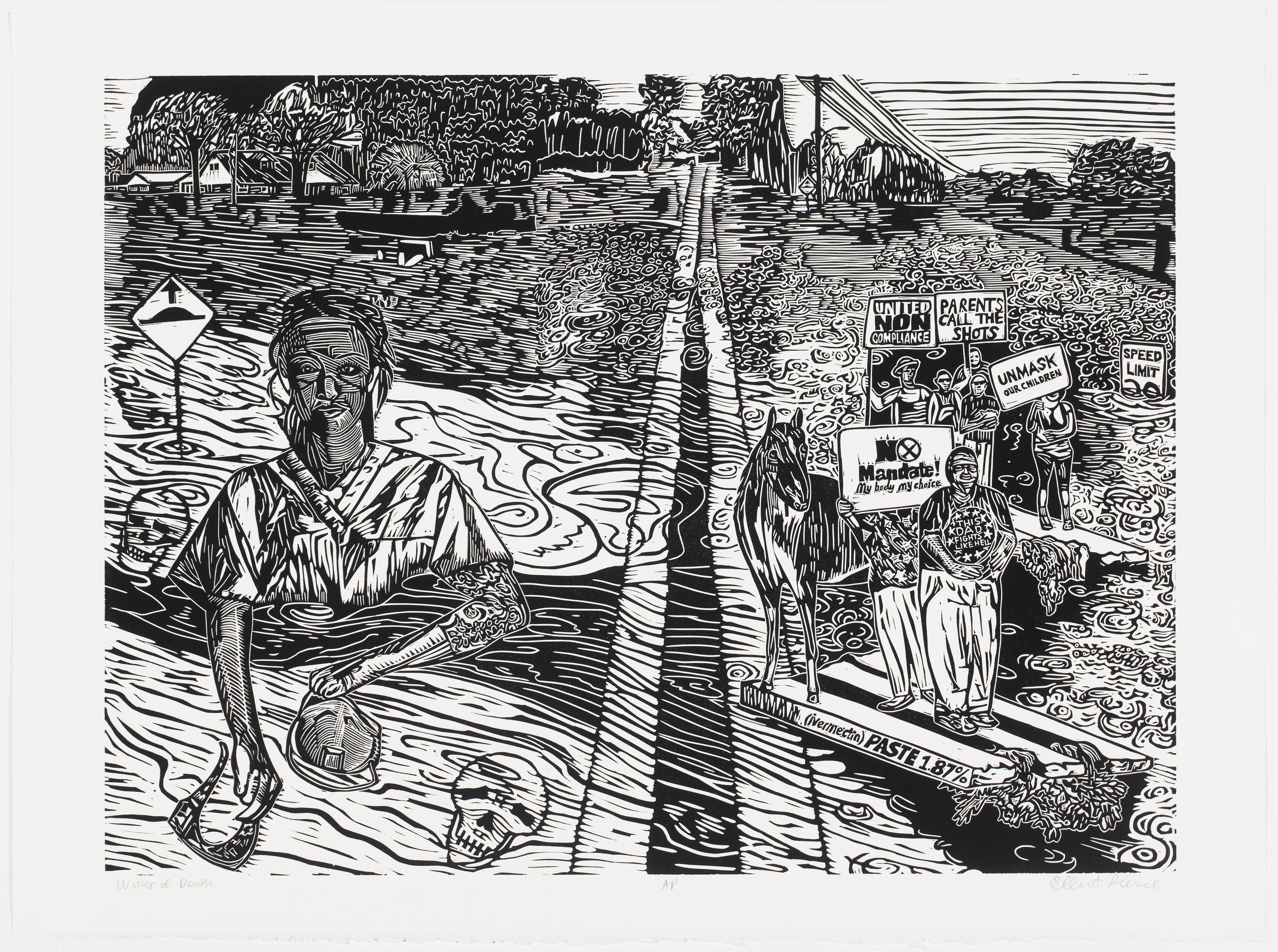 An abstract linoleum print, proofed with black ink and carved to reveal details in white. Water floods an outdoor scene. To the left side, a person stands chest deep in the water wearing hospital scrubs, in their left hand is a pair of goggles and in their right a COVID mask, held above the water in front of them. Below them, a skull floats beneath the water. They are separated by a street that continues down the middle of the scene, trees and houses in the background. On the right side of the street, a group of protesters stand on boxes and platforms above the water, with signs in capital letters that read: "united non compliance", "parents call the shots", "unmask our children", "no mandate my body my choice", and "this dad fights like hell". A horse stands next to two of the protesters.