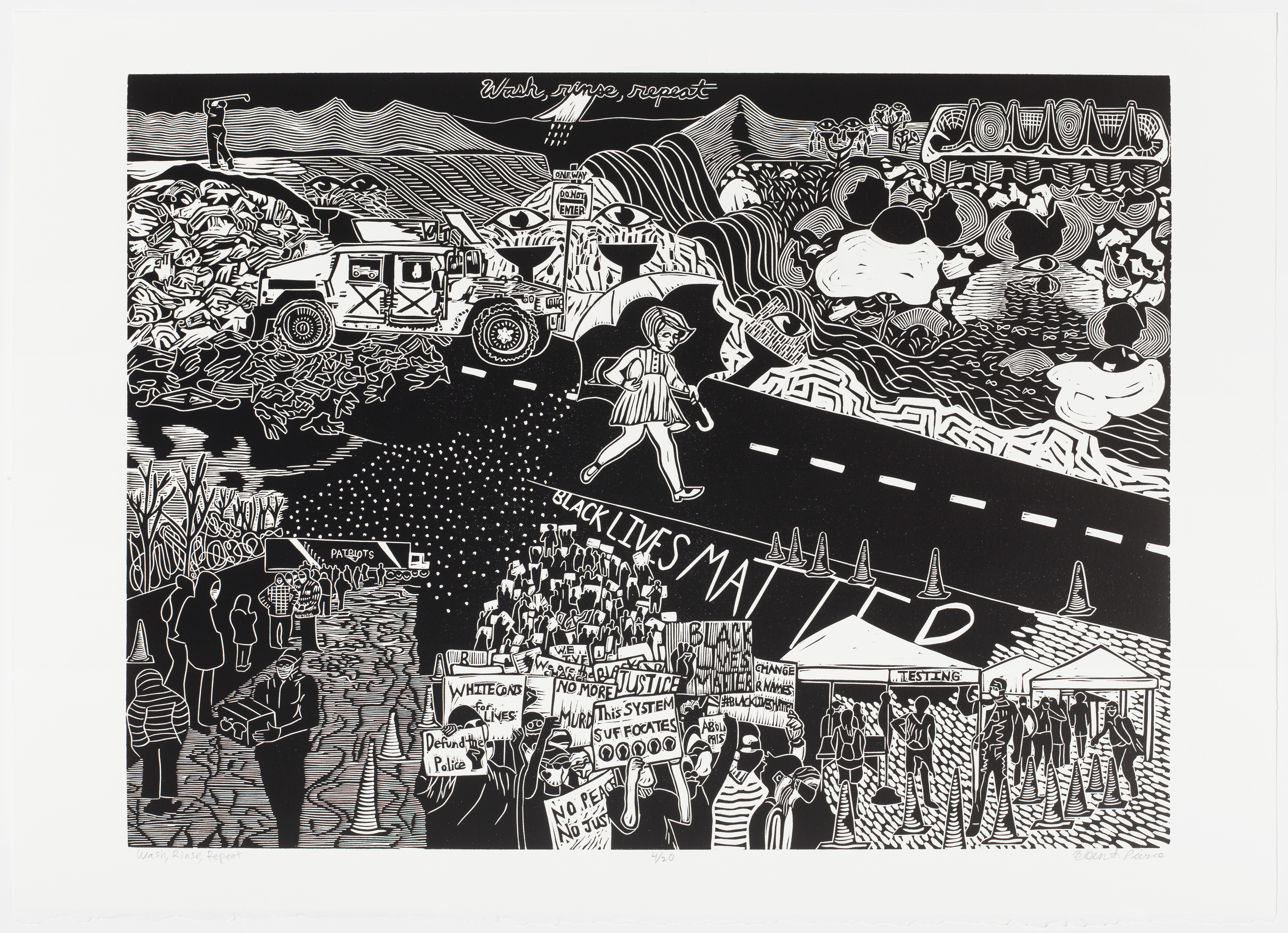 An abstract linoleum print, proofed with black ink and carved to reveal details in white. In the center is a street, a child wearing a short dress and holding an umbrella walks down holding an open container, white dots pouring out of it. In the bottom portion is a truck labeled "patriots" in capital letters and people standing around. Next to it, a Black Lives Matter protest is beside COVID testing tents. In the top portion of the piece, hilled forms with broken eggs and eye symbols fill the space. A truck drives away from a hill of used gloves and COVID masks. Faintly above the scene are the words "Wash, rinse, repeat".