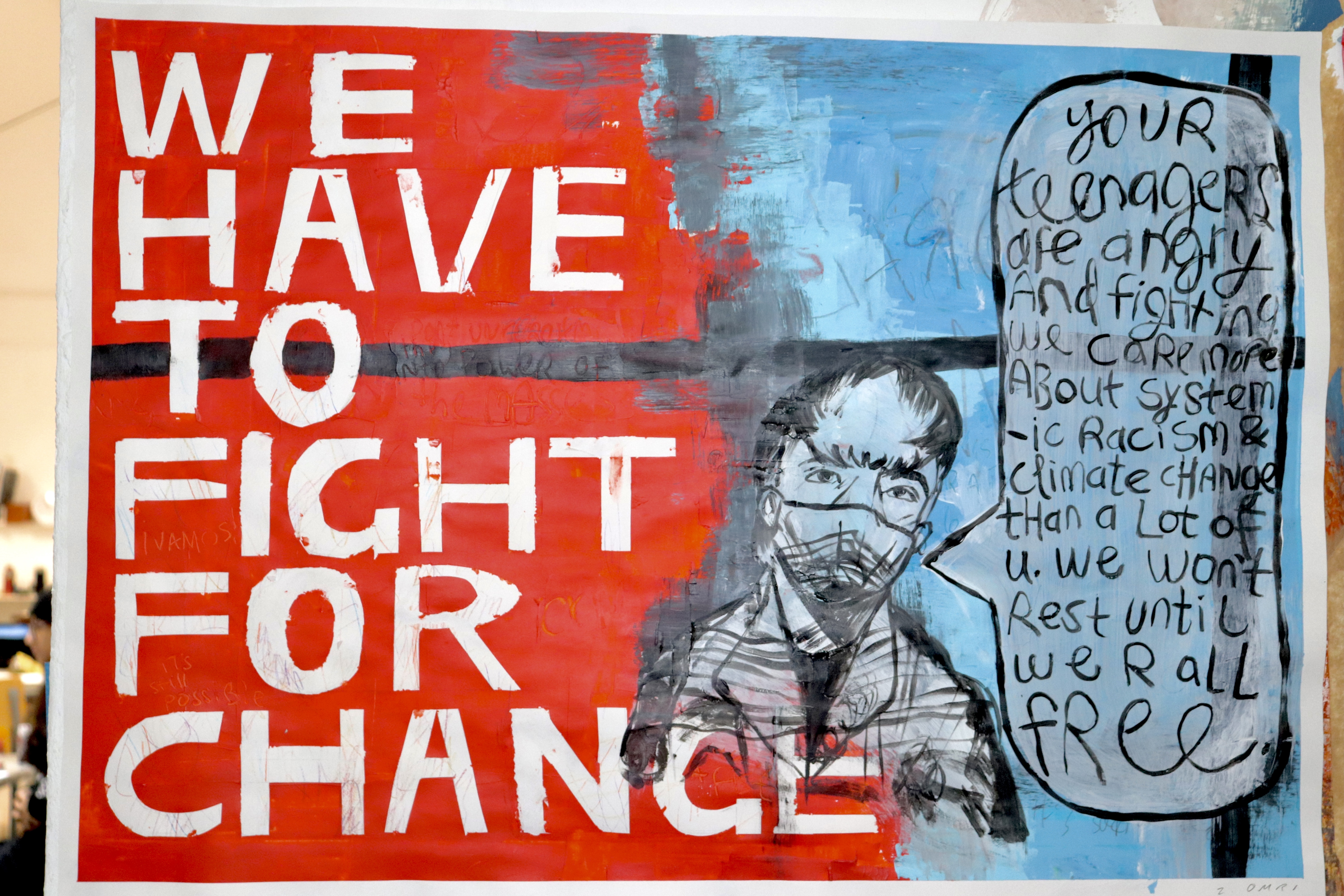 A painting done on paper. The painting is separated into two sides, one red and one blue. The red side has white lettering, reading "WE HAVE TO FIGHT FOR CHANGE", and the blue side depicts a person wearing a mask, saying "Your teenagers are angry and fighting. We care more about systemic racism & climate change than a lot of u. We won't rest until we r all free." There is a black line going horizontally through both sides and another line going down vertically on the blue side.