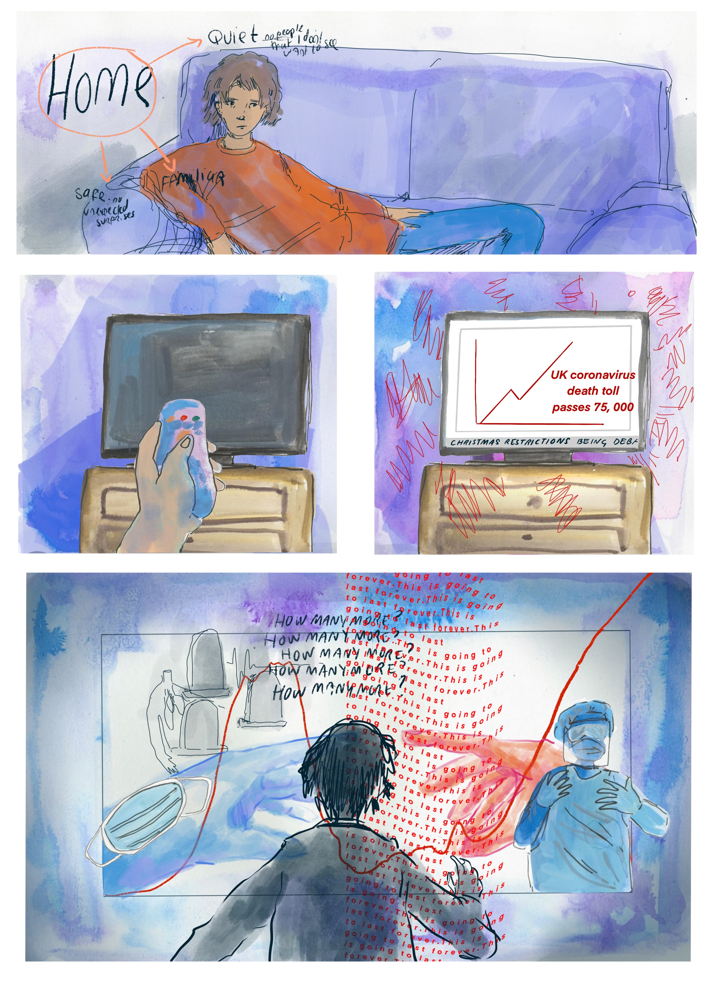 A drawing divided into four panels done in a sketchy, watercolor style. Panel 1: In the top panel is a blue couch with a figure lying across it. In the corner of this panel is the word "Home" circled in red with three arrows coming off the circle: wording off of the first arrow reads "Quiet no people that I don't want to see"; the second arrow reads "familiar"; and the third arrow reads "Safe: no unexpected surprises." Panel 2: A square with a blue watercolor-style background. There is a brown cabinet with a tv that is off resting on top of it. In the center of the panel is a hand holding a tv remote. Panel 3: In the same perspective as panel 2 with the cabinet and the tv. But, the tv is displaying a graph steadily increasing. The TV reads "UK coronavirus death toll passes 75,000" in red. The bottom of the screen reads "Christmas restrictions being deba". Surrounding the TV are red scribbles. Panel 4: The same blue watercolor background. There is a box creating a border in the panel. Spanning the inside the box, two hands, one blue and one red, reach out to each other. In the left upper corner of the box are gravestones. In the bottom left corner there is a blue surgical mask. On the right side is a doctor wearing an apron, mask, face shield, goggles, and gloves. Written repeatedly in red in the center of the panel is "This is never going to end." Overlapping that writing reads "How many more" five times. The figure from the first panel stands in front, only the back of their head and shoulders visible.