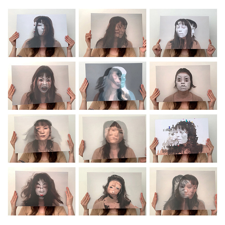 A series of images displays a woman holding life-sized photographs of herself in masks and face paint over her face. Each photo is taken of the artist's chest up and the photographs the artist is holding lines up with her shoulders. Many of the images are distorted via digital editing or double exposure, creating an eerie atmosphere. The images are meant to be reminiscent of the Zoom call layout, and can be seen as a video call with all the artist's different selves.