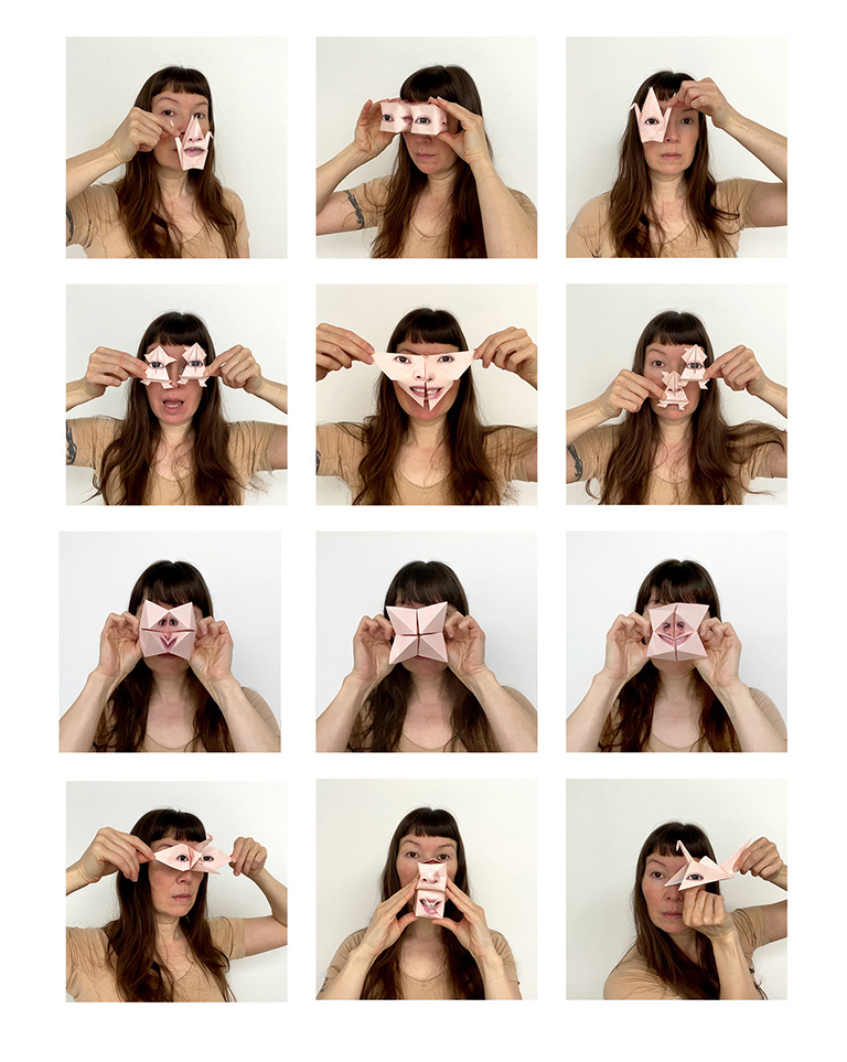 A series of twelve self-portrait photographs displaying a woman wearing origami sculptures as partial masks. The sculptures include paper cranes, frogs, boxes, cootie catchers, and butterflies. Each origami sculpture is printed with a photograph of one or more of the artist's facial features. She holds the masks so that the printed feature covers that portion of her face.