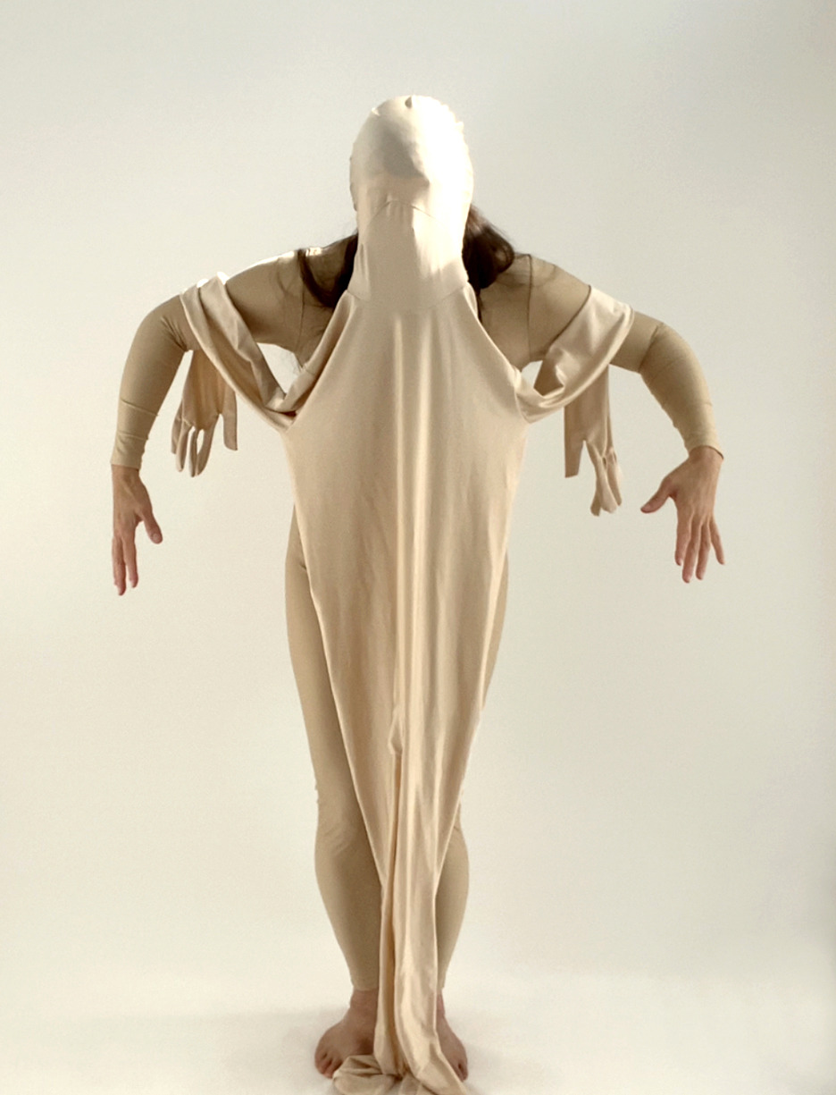 A self-portrait of a woman standing up, leaning forward slightly in a nude, spandex bodysuit with another nude full-body bodysuit draped over her. Her elbows are angled upwards with a squared appearance. The body suit hangs on her face and drapes in front of her body, down to the floor. The arms of the suit loop over behind her own and hang behind her arms, creating the illusion of four arms.