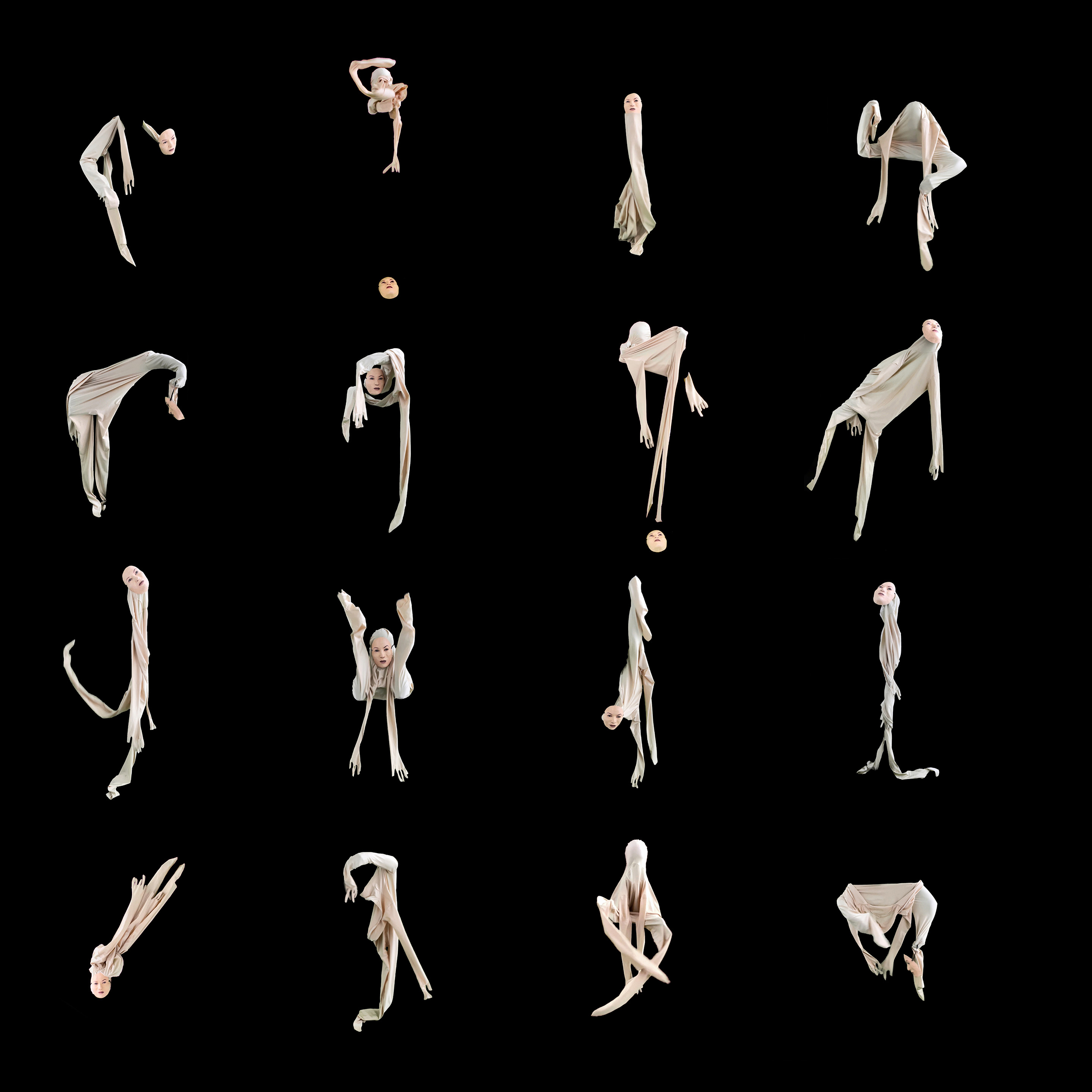 A compilation of several photographs in a four by four grid taken during the artist's performance with 'skin' suits (tan body suits). The artist's body is obscured by a black bodysuit, which blends into the black backdrop seamlessly. She poses dynamically, draping the tan body suit over herself, creating twisted, abstract poses. These poses express movement and gestures, reminiscent of letters in a written language. Attached to some of the poses, and detached from others, are papier mâché masks of the artist's face.