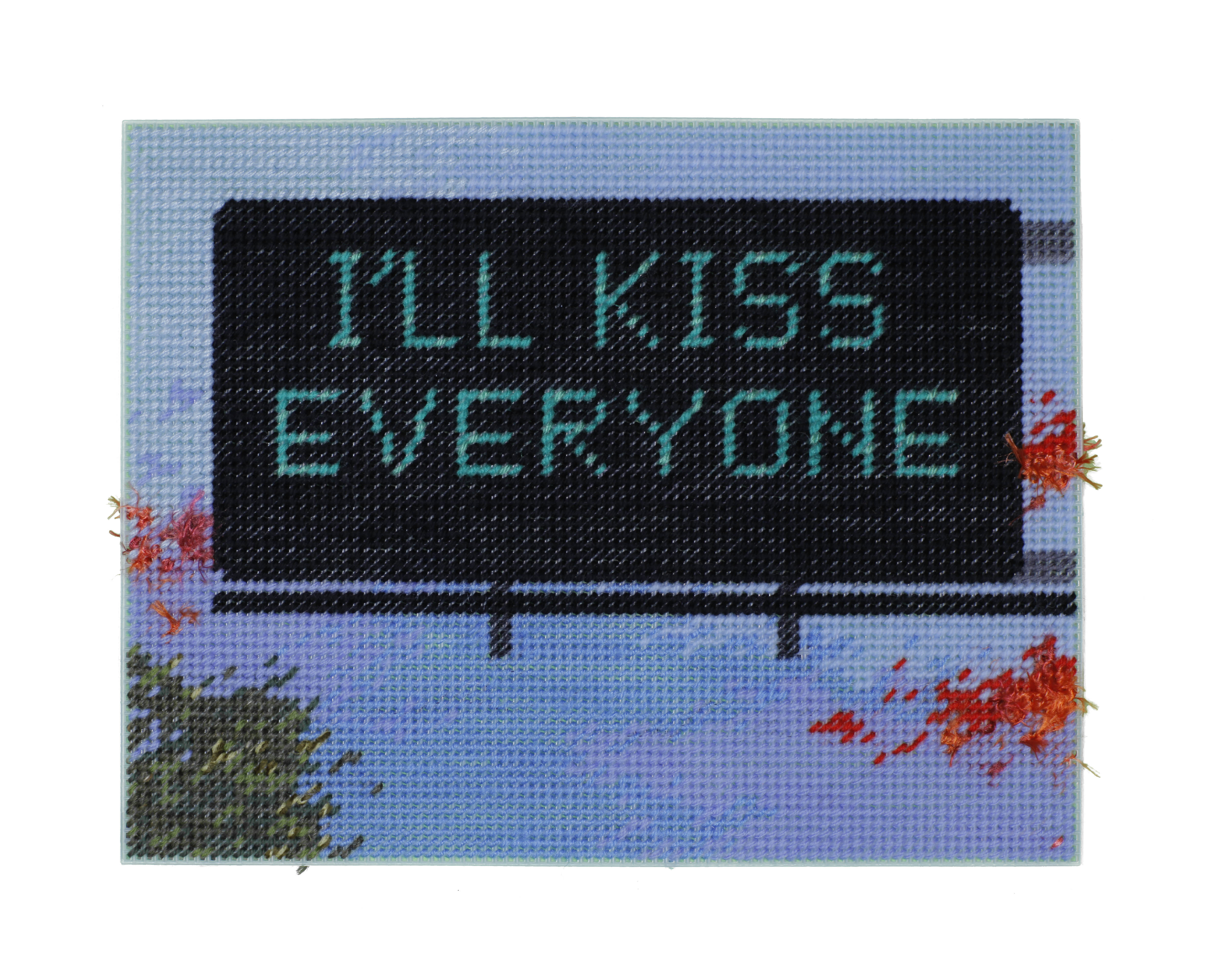 A hand-stitched mixed media depiction of an LED billboard that says "I'LL KISS EVERYONE" in blue threading. The billboard reaches into the scene from the right side. The background is a blue sky with hues of purple, and there is some shrubbery in the lower left corner. There are a few patches of fiery red threading surrounding the billboard.