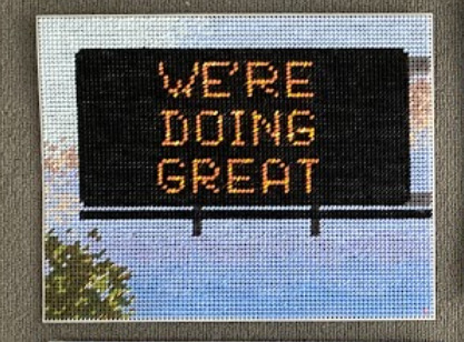A hand-stitched canvas depicting an LED billboard that says "WE'RE DOING GREAT" in orange and yellow threading. The billboard reaches into the scene from the right side. The background is a sky in hues of blue with a few clouds and there is some shrubbery in the lower left corner.