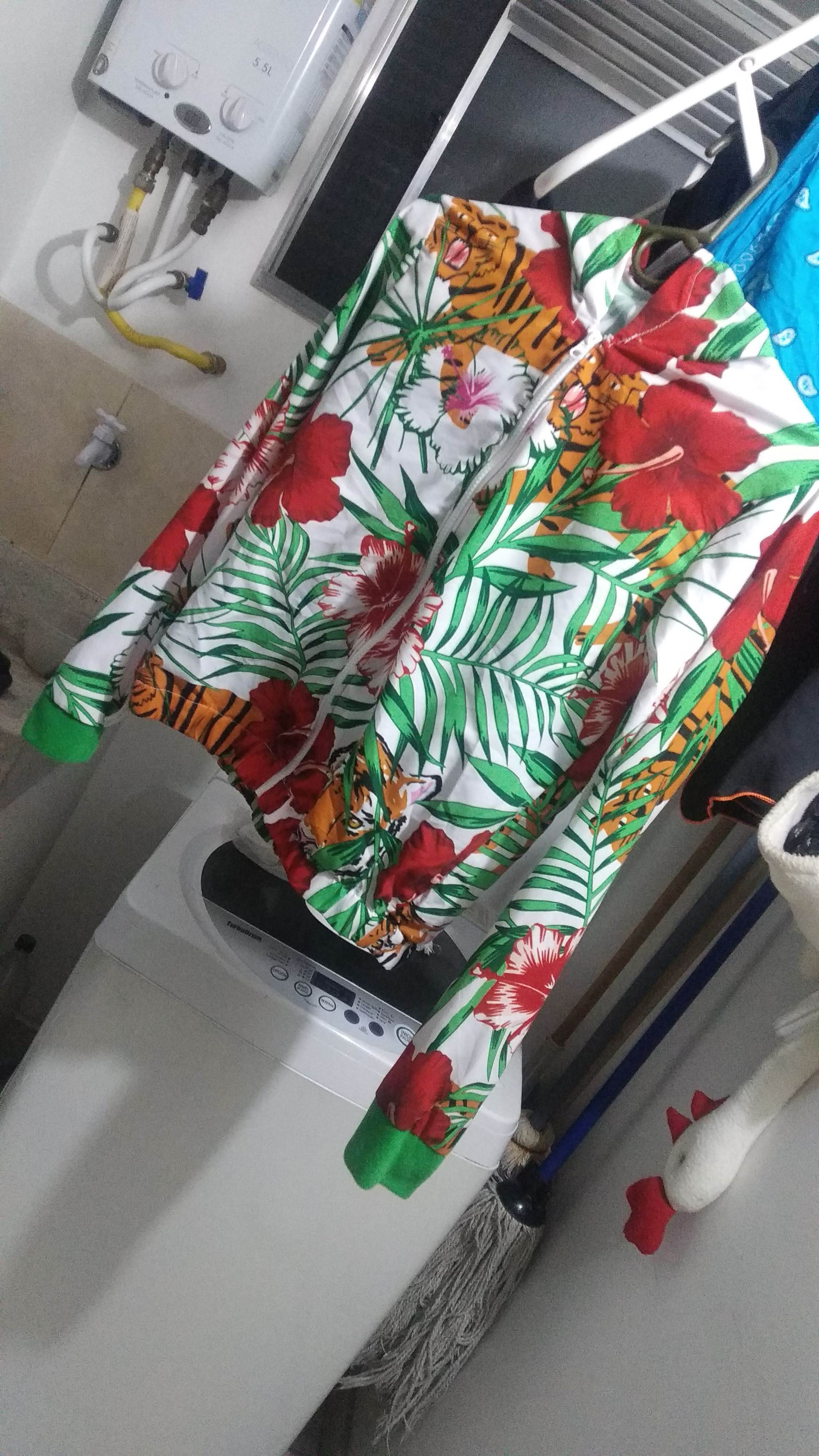 A handmade zip-up hoodie made with a patterned fabric. The fabric has a white background, red hibiscus flowers, red and white hibiscus flowers, green fern-like plants, and orange tigers walking among the plants and flowers. The hoodie has green cuffed sleeves.