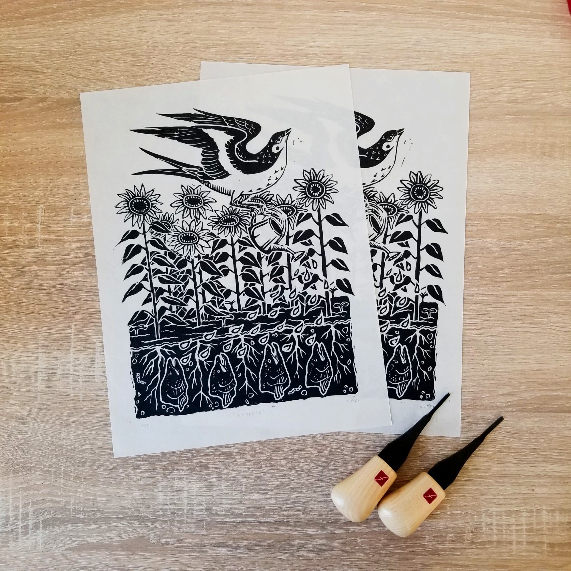 Two pieces of slightly sheer white paper with the same stamped image in black ink. The image is a large bird pouring a watering can over a garden of sunflowers with its feet. Below the soil the flowers are growing in are fish heads, worms and pebbles between the roots. Laying beside the paper are two Flexcut Palm Carving Tools.