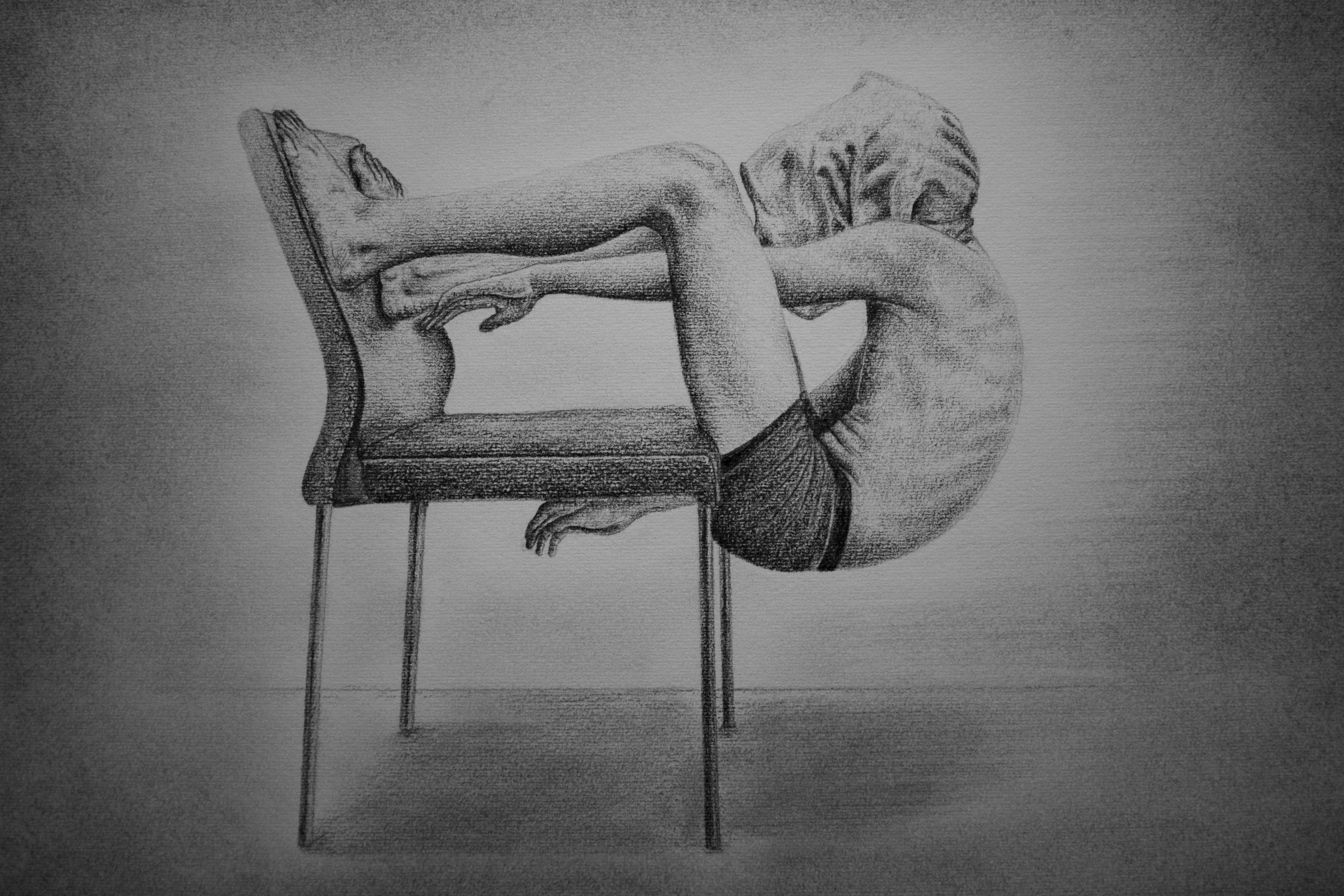 A black and white drawing of a person with fabric wrapped around their head, sitting on the front of a chair with their feet at the back of the chair. The person is hunched over their feet with their arms hanging limp by their feet, and they are wearing only boxer shorts. The sides of the image are shaded in a vignette so the lightest part is around the person.