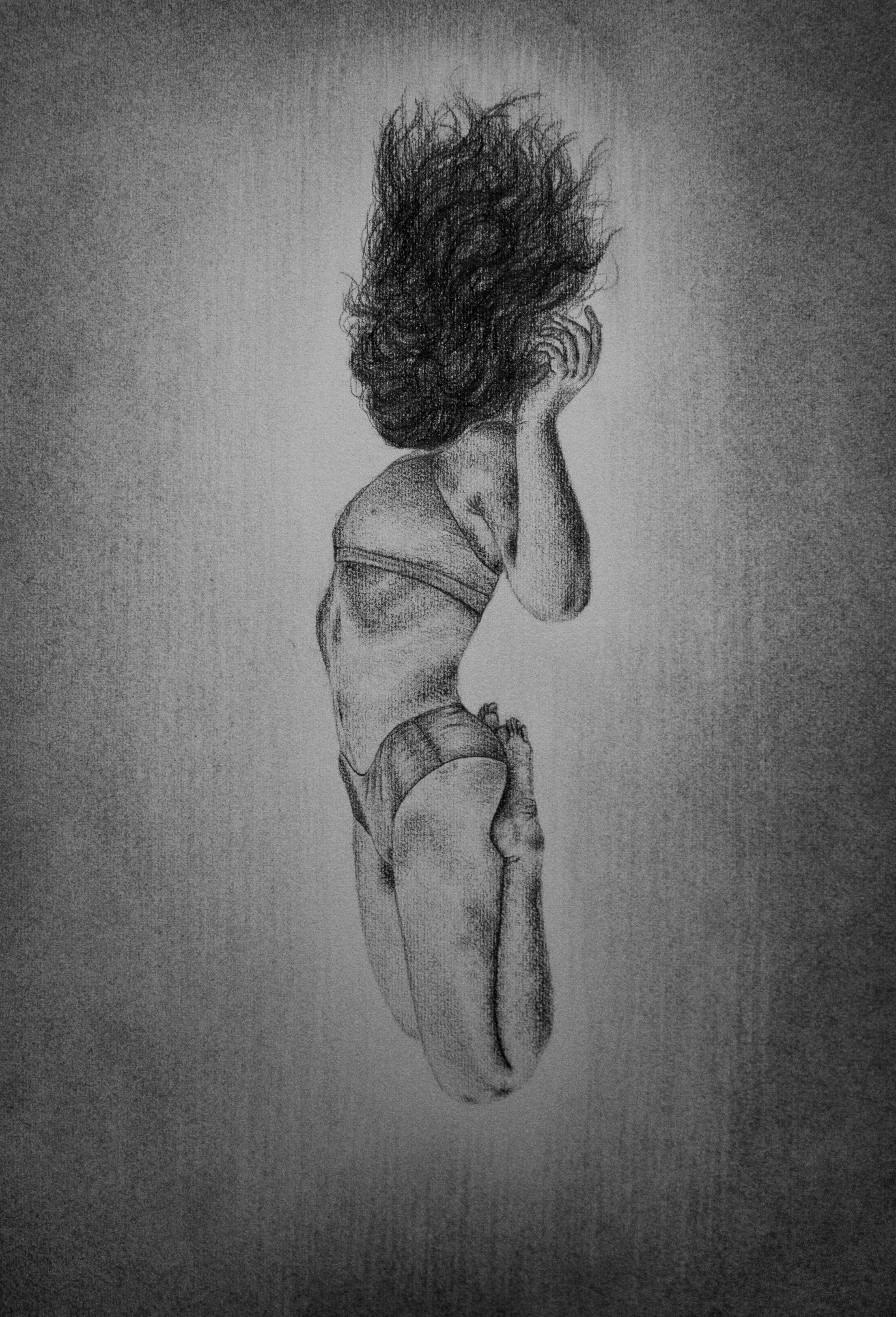 A black and white drawing of a person with long, wavy hair laying with their elbows bent and hands by their head and knees bent so their legs lay under them. The person is wearing a bra and underwear and we cannot see their face as it is covered with their wavy hair. The image is turned sideways so the person appears as though they are falling. The sides of the image are shaded in a vignette so the lightest part is around the person.