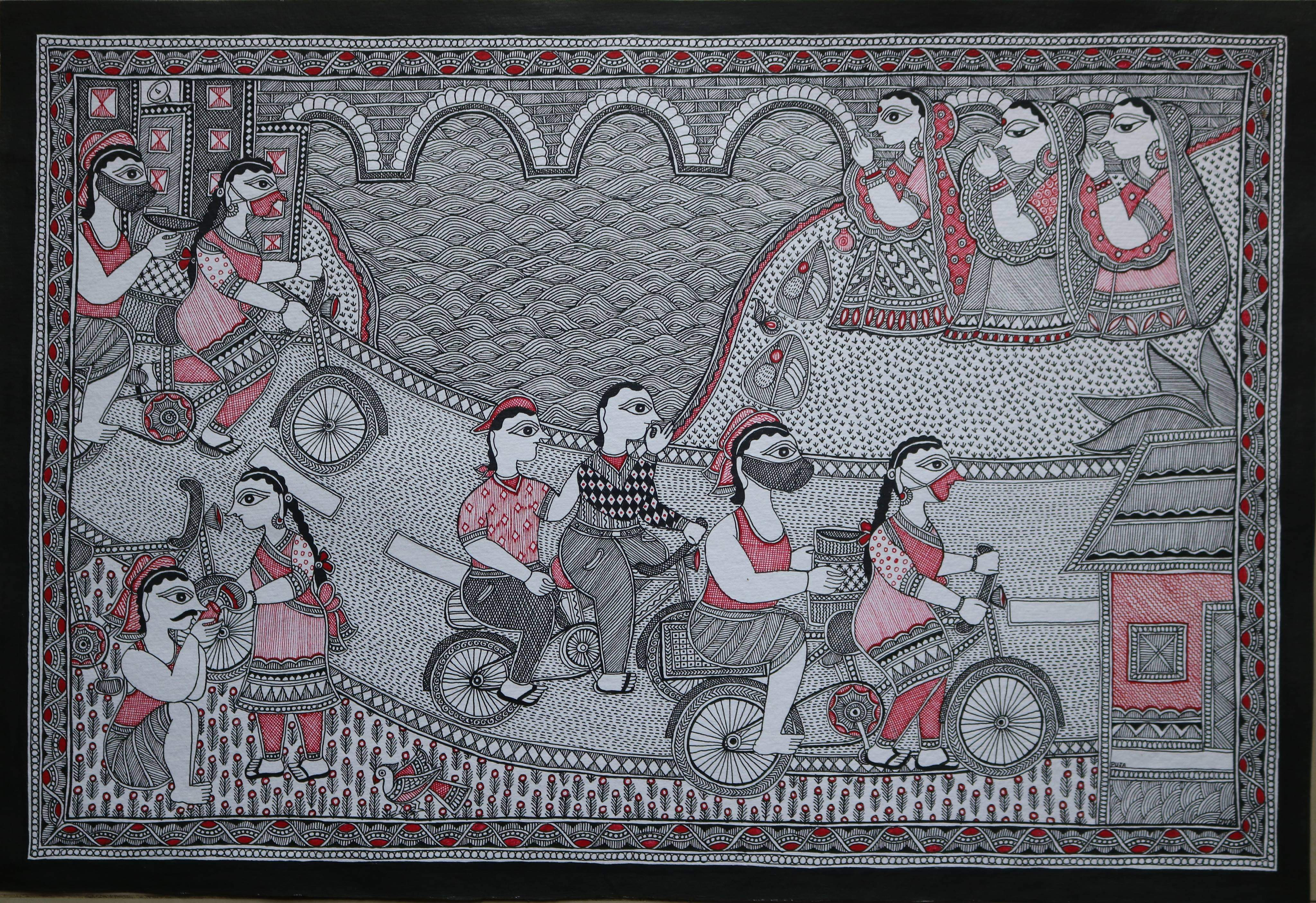 A photograph of a detailed black, white, and red mithila painting of people biking on tandem bikes down a street, most of them wearing facemasks and some wearing traditional Indian clothing and long braids. The top of the road comes from a cityscape stemming in the top left corner of the painting and ends in the lower right corner behind a small red house. Two people are stopped on the side of the road in the lower left corner to drink and in the upper right three people are sitting, praying in traditional Indian clothing with headpieces and large earrings. They are facing the water which runs in front of the city and bridge along the back of the painting.