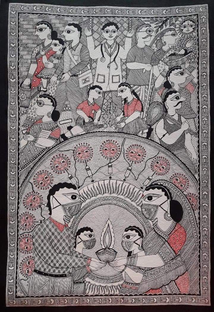 A photograph of a detailed black, white, and red mithila painting of people separated by an arch filled with covid molecules with sad faces and syringes below each of them, following the arch. Below the arch are four people facing each other, holding a candle, wearing masks. The two people on the left have very short hair and the other two have earrings, long wavy hair, and are wearing traditional Indian clothing; the people in the front appear to be adults with children behind them. Above the arch, no one is wearing a mask and all of them are smiling, and doing various things. There is a person in the middle with their hands up in a physician's attire.