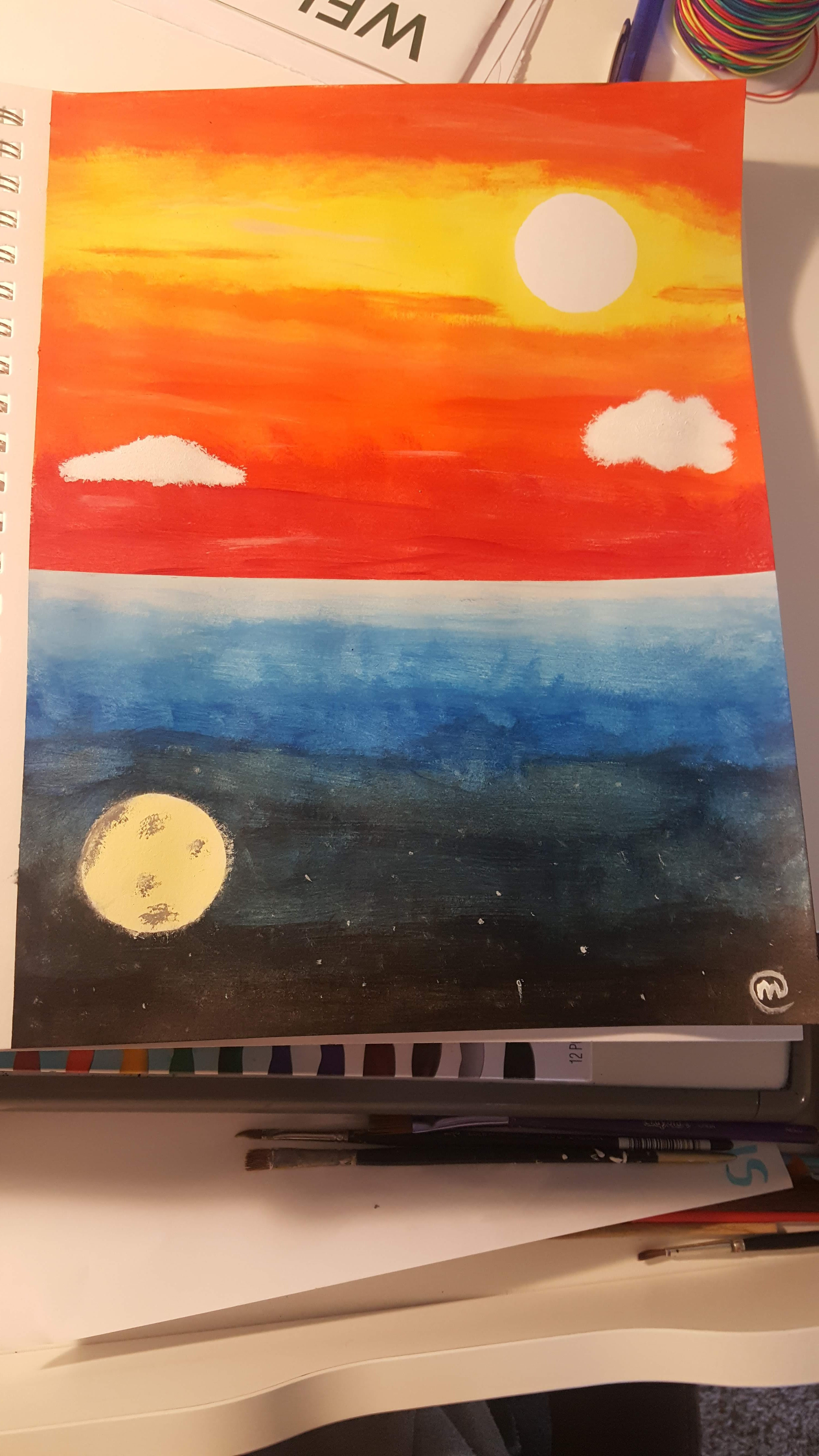 A painting of a sunset on a yellow, orange, and red background with two, small white clouds scattered below it. The sun is in the top right corner, the lightest yellow portion surrounding it. The painting is split in half horizontally so below the sunset is a dark, gradient blue sky with the moon in the lower left corner. The darkest portion of the gradient surrounds the moon, lightest touching the red hues of the sunny sky. Surrounding the moon are white speckles, resembling stars.
