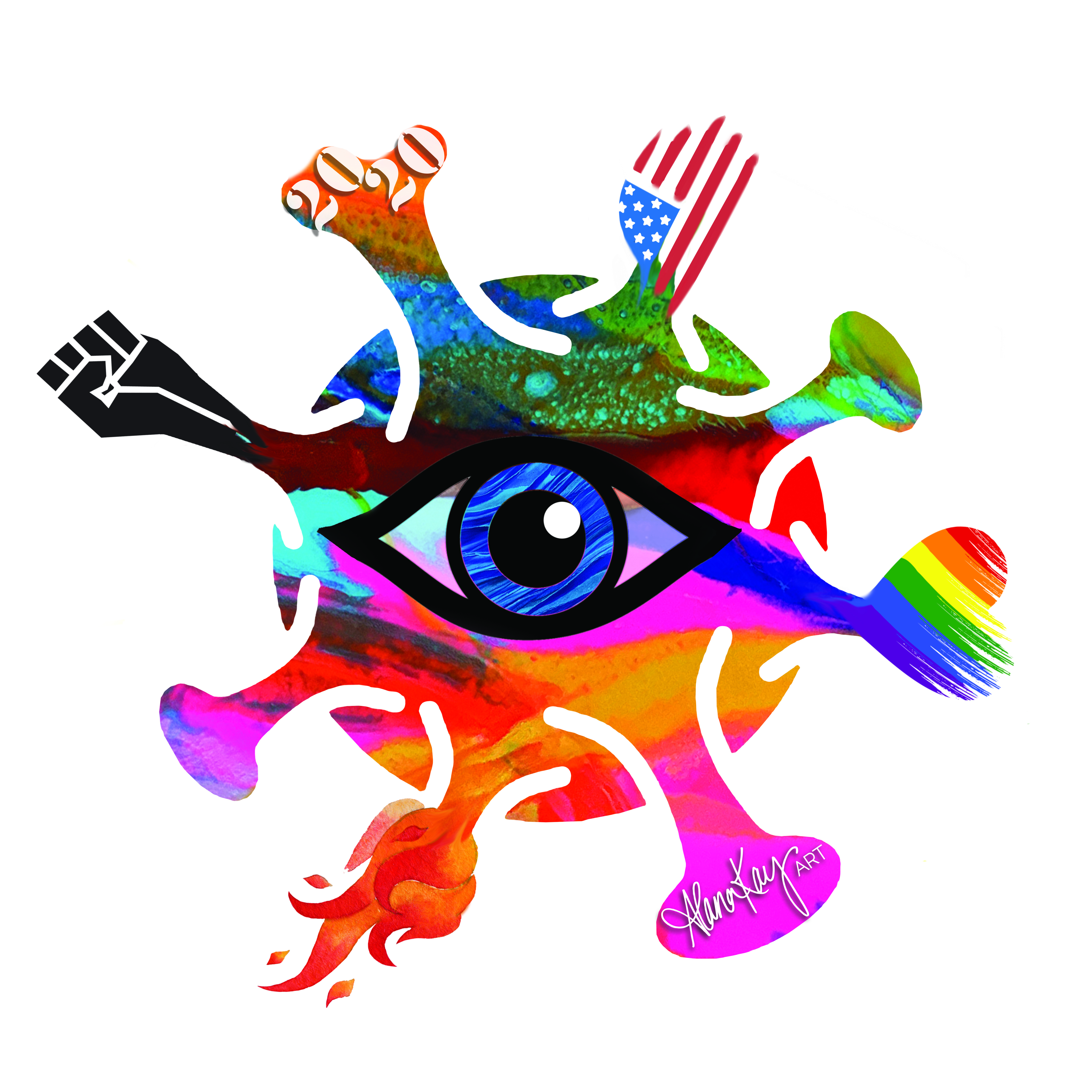 A digital artwork of a covid-shaped molecule with a blue eye in the middle. There are different things coming off the spikes of the molecule such as the black power symbol fist, the numbers 2020, an american flag, a fire, a rainbow heart, and "Alana Kay ART" in cursive. The background of the molecule is wavering lines of colorful, bright resin pour art.