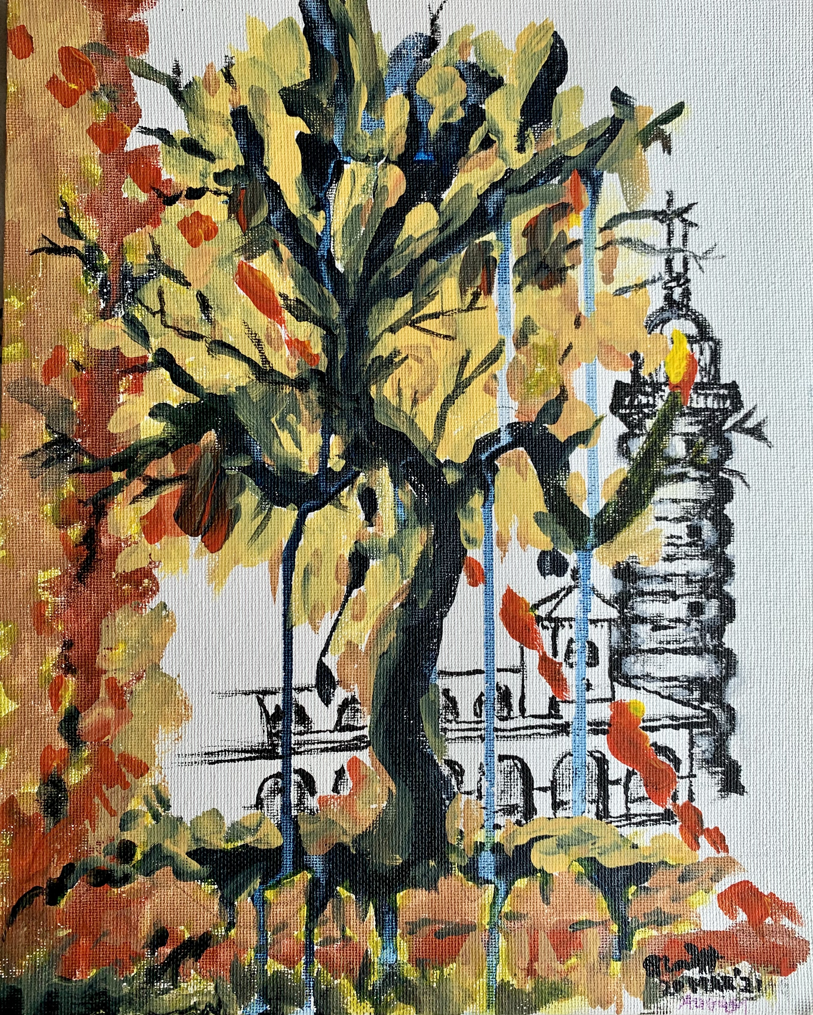 An abstract painting made with water based paints on canvas. In the foreground is a tall tree with twisted black and green branches that reaches from the bottom to the top of the piece. The leaves of the tree are made of yellows, oranges, and greens. Thin blue strokes fall from the top of the tree and drip down to its roots. The roots span from the left to the right of the piece and are covering a pile of orange, red, yellow, and green. To the far left of the piece are short strokes of yellow, orange, and red that overlap each other. Reaching from the top left corner to the bottom right corner is a line of short red strokes. Behind the tree is the black outline of a building with many archways with a rounded tower-like structure to the right of it. The remainder of the background is white.